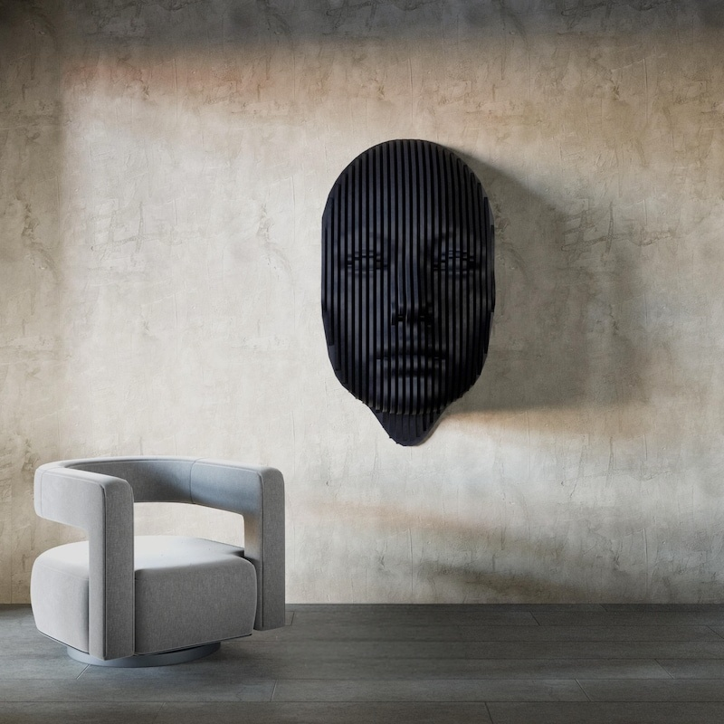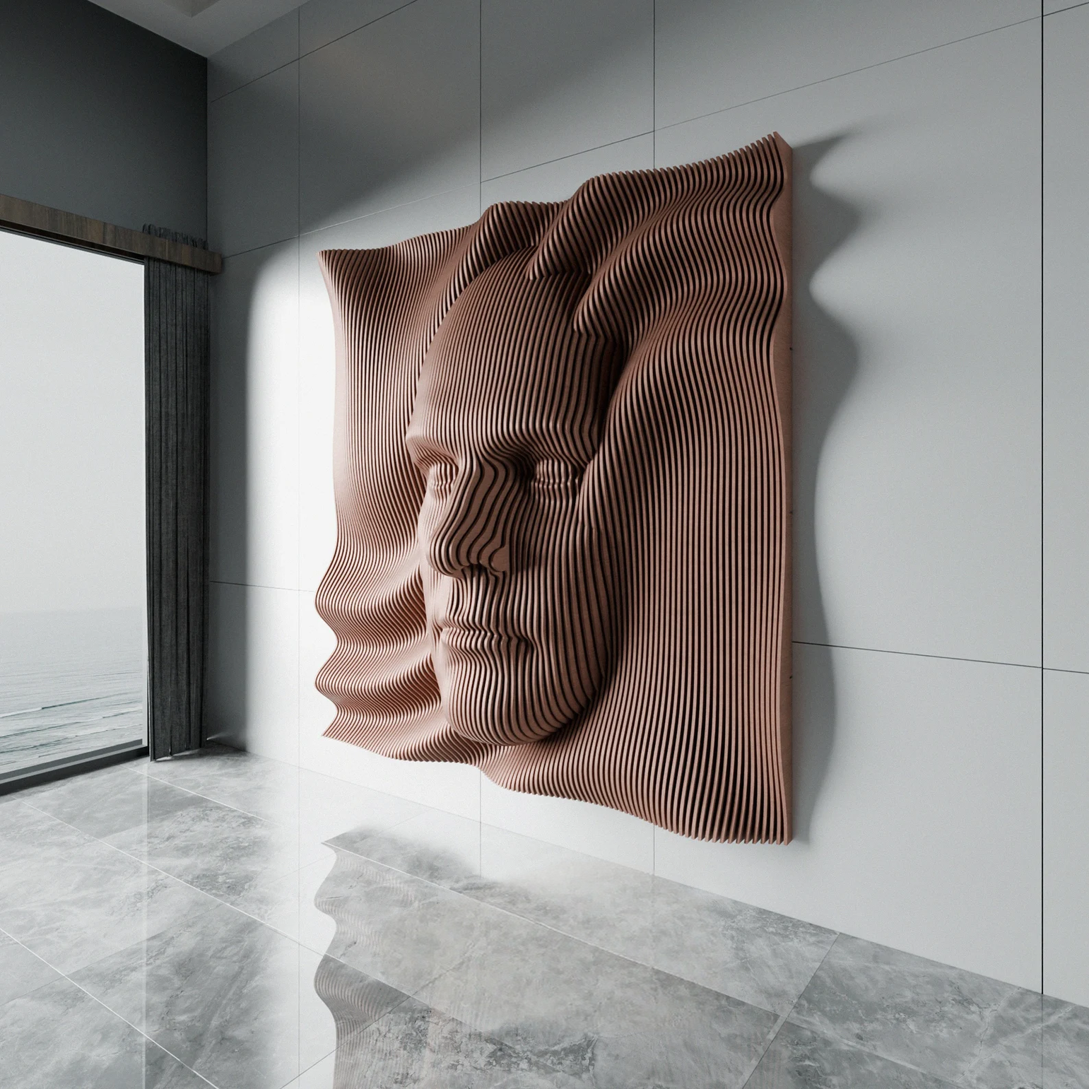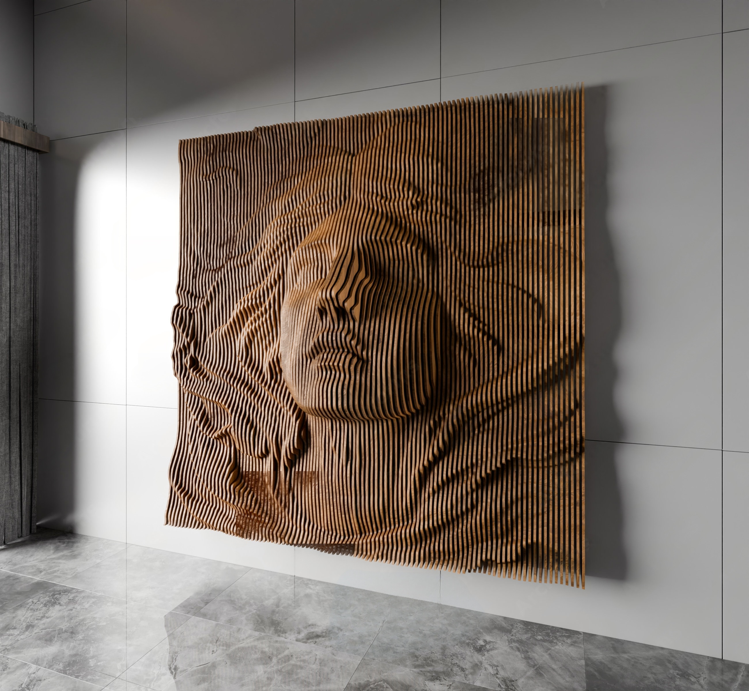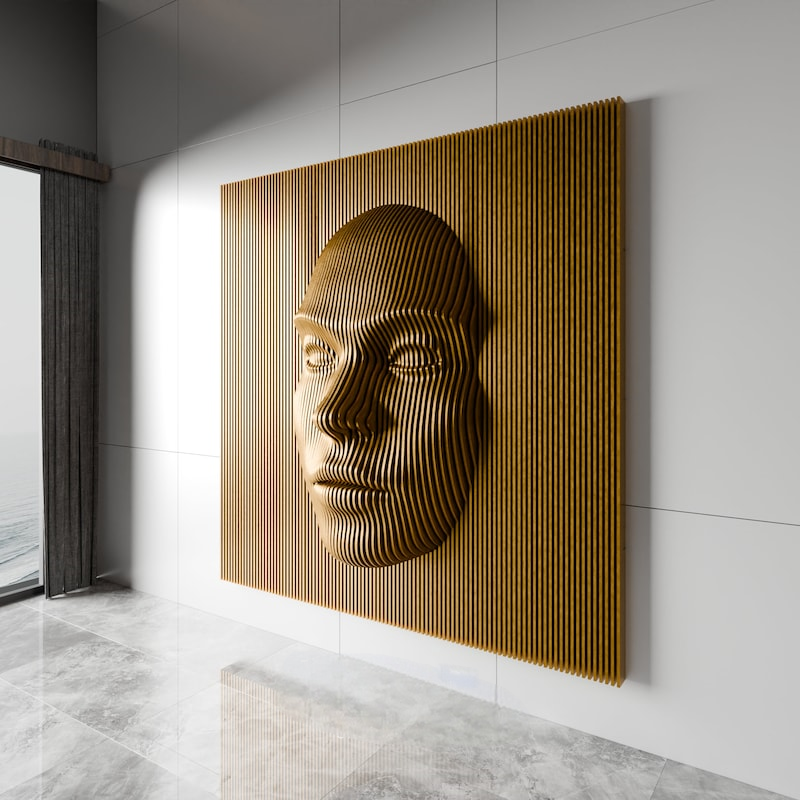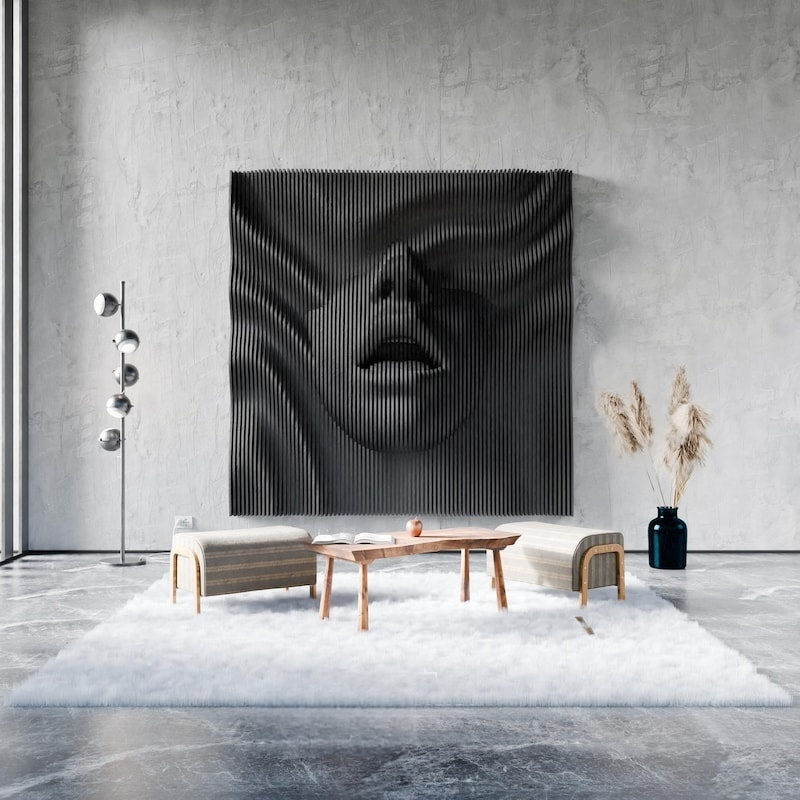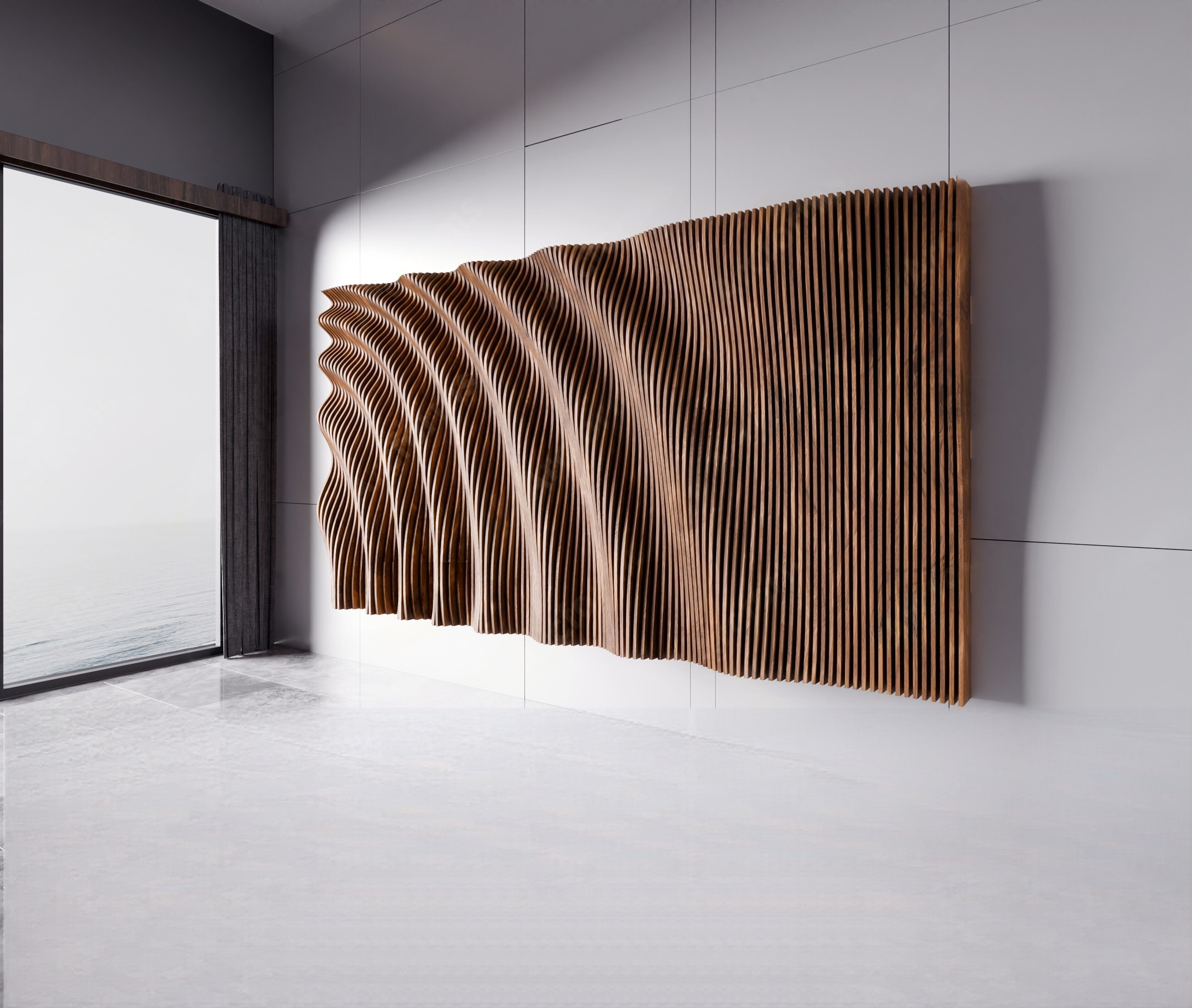 يُسهم هيكله المموج الكثيف في تحسين التأثير الصوتي المكاني، ما يجعله مناسباً للمساحات العملية كغرف المعيشة الحديثة وقاعات السينما المنزلية؛ فاللون الأزرق الداكن والملمس غير اللامع لا يعكسان فقط هدوء المساحات ذات التصميم البسيط، بل يُضفيان أيضاً حيويةً على المكان من خلال تباين الضوء والظل في التموجات ثلاثية الأبعاد (التي تُظهر طبقات متناوبة من الأزرق الفاتح والداكن بزوايا إضاءة مختلفة). يُكمل الشكل الأفقي الممتد للعمل الفني الفراغات في الجدران الكبيرة، فهو يُشكل المشهد البصري الرئيسي للجدار، ويُحقق في الوقت نفسه وحدة الوظيفة والجمال من خلال الجمع بين المادة والشكل.