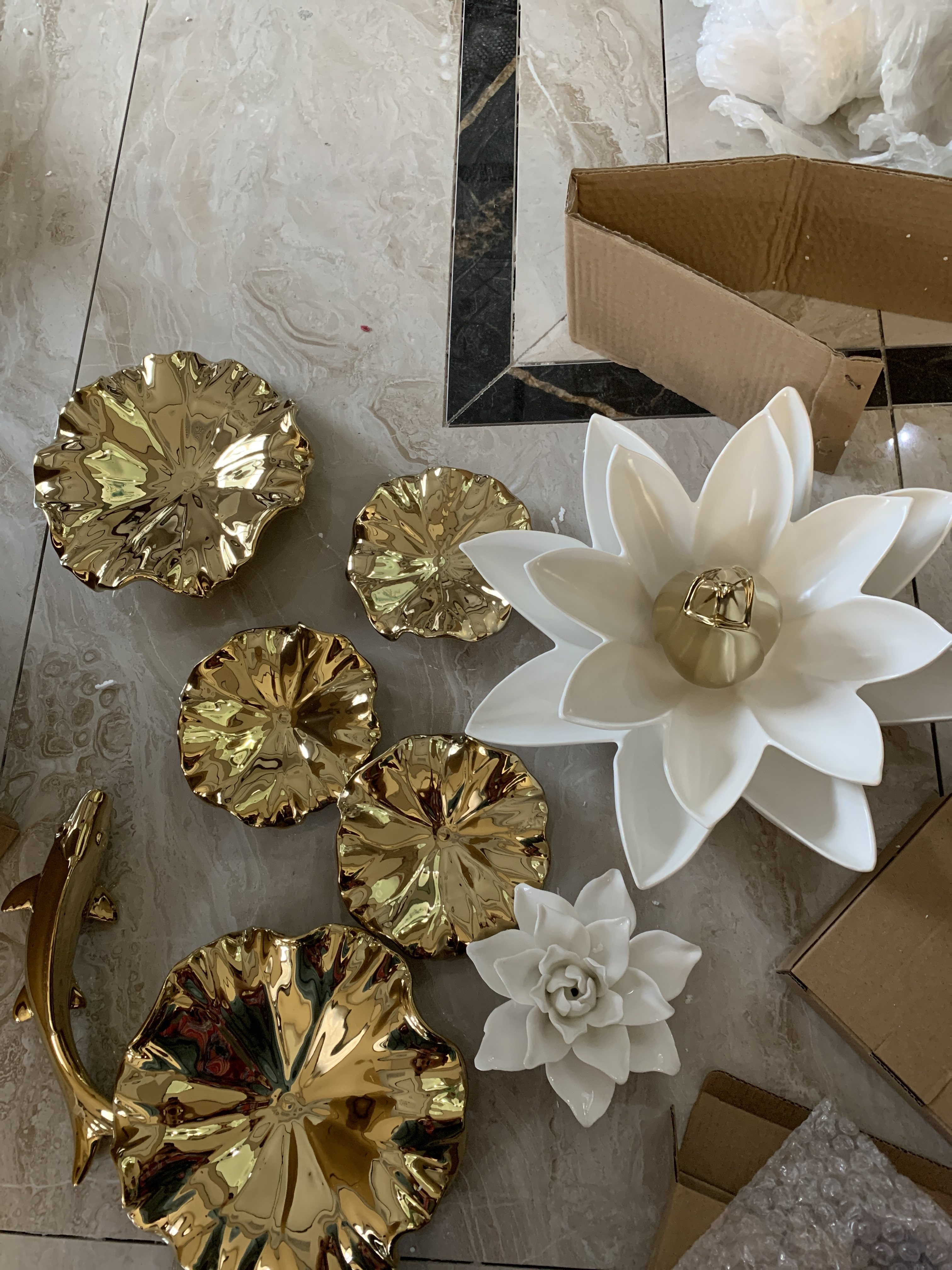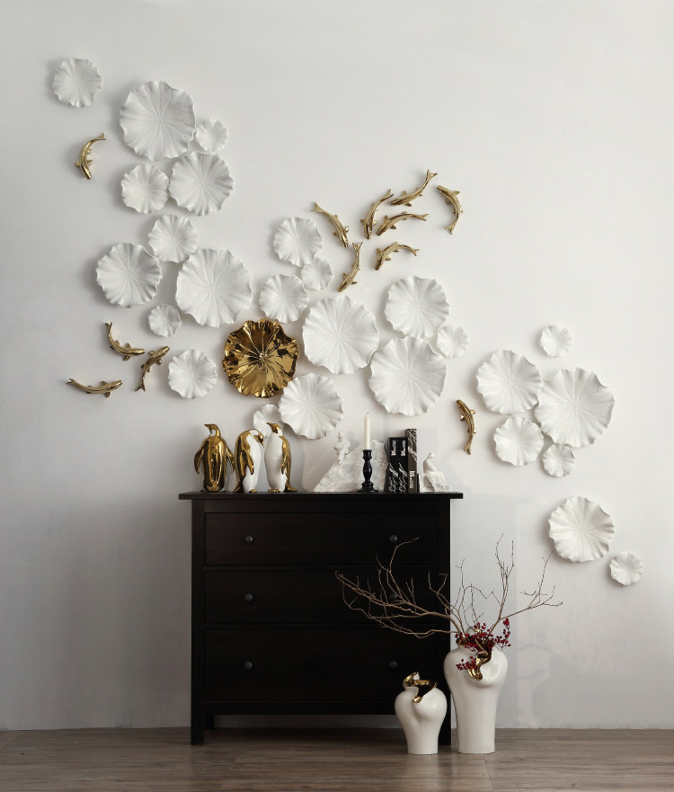 ملمس دافئ أوراق اللوتس التزجيجية البيضاء يشكل طبقة لونية مع الجدار الأخضر الداكن، بينما العناصر الم (أوراق اللوتس الجزئية، الكلابي، الأسماك) تتردد مع المصباحات الذهبية في المساحة في المادة. ترتيب الوحدات المتناقصة لا يكرر فقط الشعور الطبيعي للبركة ولكن أيضًا يكسر توتر الجدار من خلال الشكل ثلاثي الأبعاد. خلال النهار، تتنكس المادة التزجيجية البيضاء الضوء الناعم؛ في الليل، تقدم جوًا أنيقًا لـ"ظل ذهبي يعكس اللوتس" مع الإضاءة. إنه ليس فقط حامل بصري لتصور الفن الشرقي ولكنه يعزز أيضًا النغمة الأنيقة للمساحة من خلال تصادم المواد.