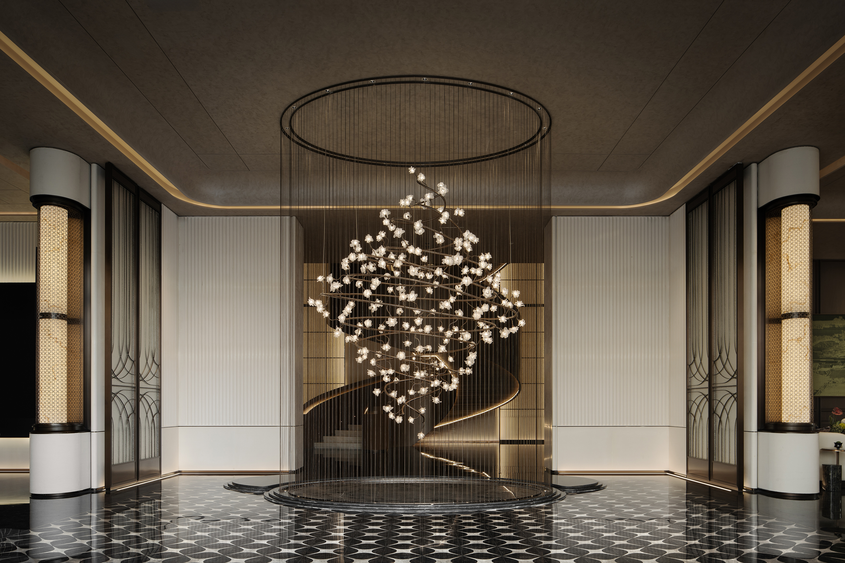 تُستخدم في المساحات الكبيرة مثل أذكار الفنادق العالية المستوى، غرف المعيشة في الفيلات ذات القماش المزدوج، ومعارض الفن—تعمل كإضاءة أساسية وكأعمال فنية مثبتة. ميزتها الرئيسية هي خاصية "الوظيفة + الجماليات" المزدوجة: بنية الأسلاك المحيطة تقلل الضغط المكاني، والشكل الحلزوني يتكيف مع الامتداد الرأسي للمساحات ذات السقف المرتفع. نقاط البيع تكمن في "الفن يمكن تخصيصه": يمكن تغيير حجمها لتناسب مساحات مختلفة، ويعمل عناصرها الطبيعية على تحقيق أسلوب "فنحي غير متكبر"، مما يجمع بين الذاكرة البصرية وقوة خلق الأجواء.