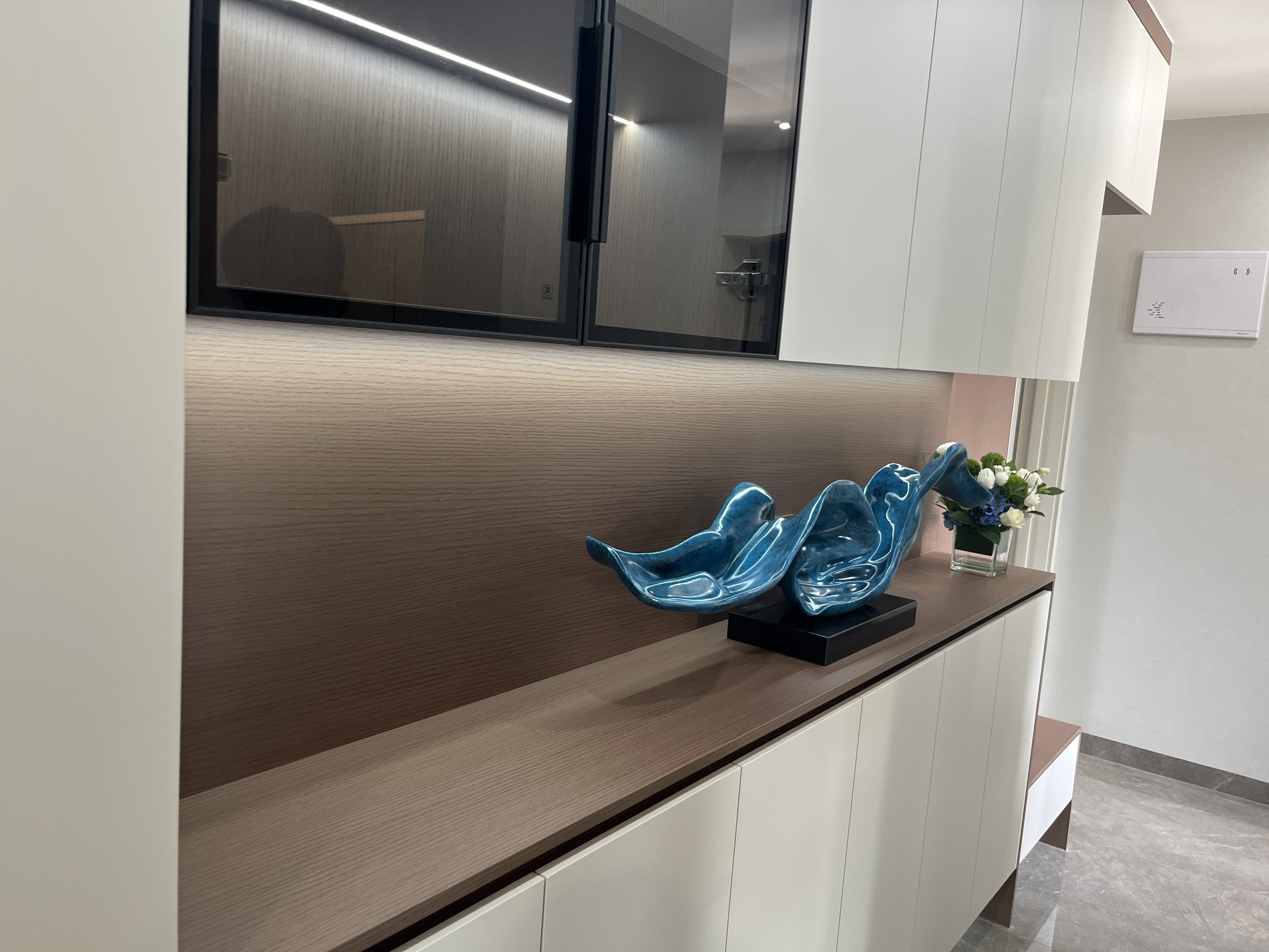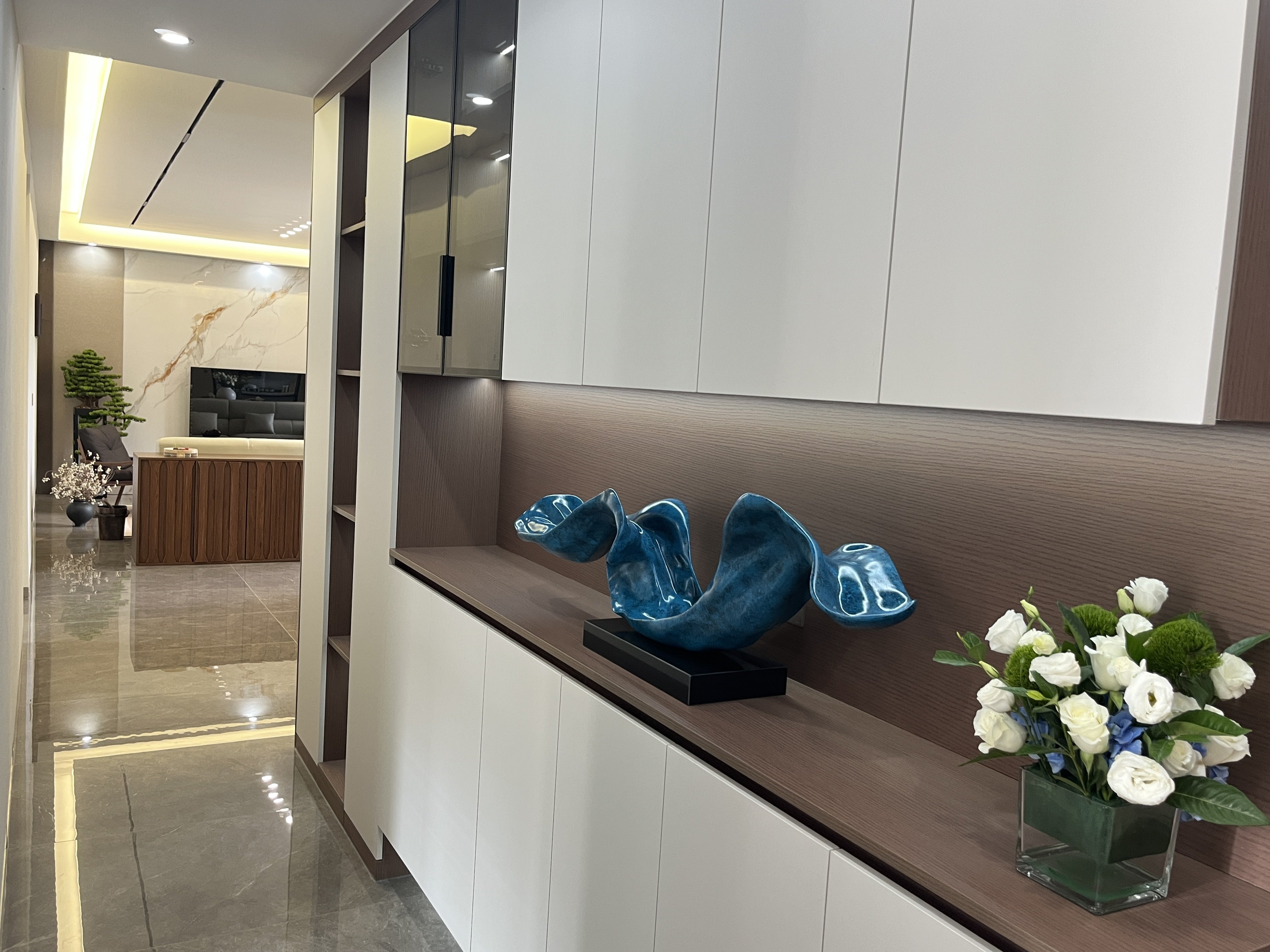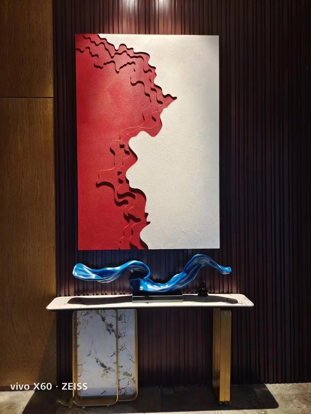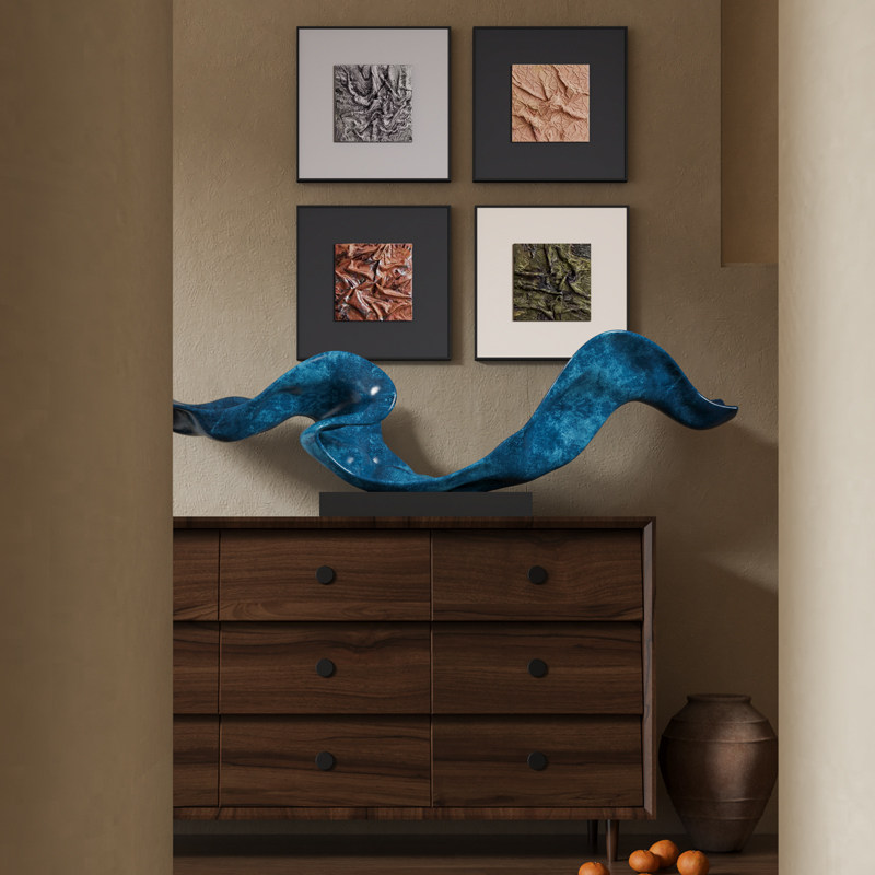 عندما تلتقي منحنيات المتدفق باللون الأزرق الأعمق للأنهار مع ضوء المعدن، تصبح هذه الفنون التثبيتية "التركيز البصري" للمساحة. إنها تستخدم اللون الأزرق السماوي المتدرج لتصميم شكل أنيق، مثل الأمواج المتجمدة الممتدة في المساحة؛ تركيزات الحصى المعدنية في الخلفية تتوافق مع الشبكات العمودية، وتضيف أناقة الفخامة الخفيفة إلى الملمس البارد.