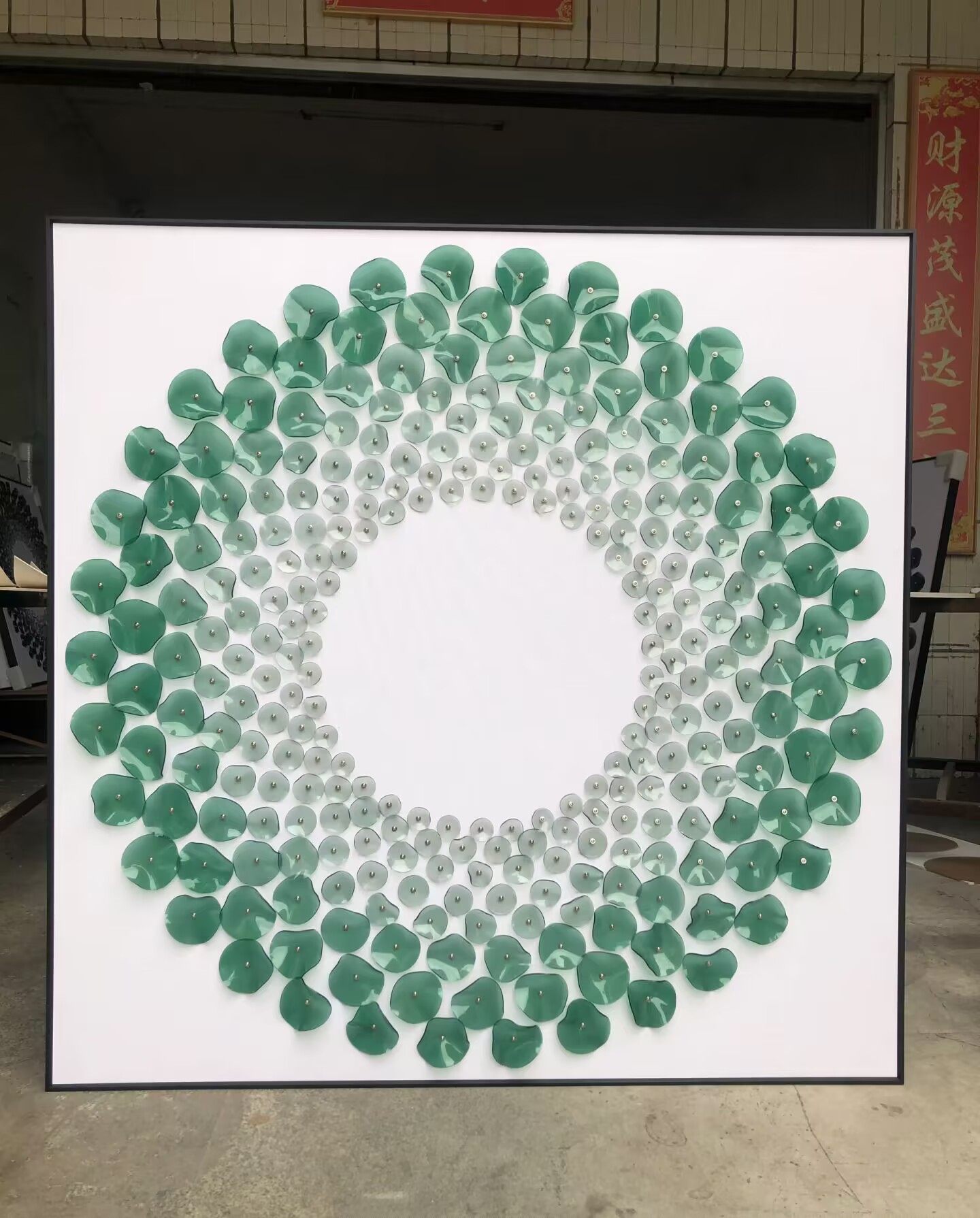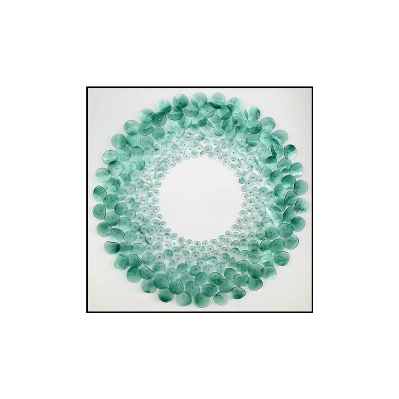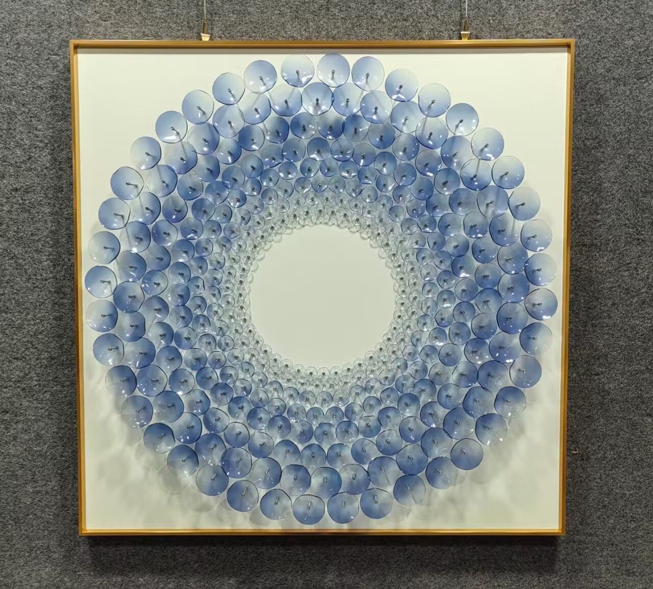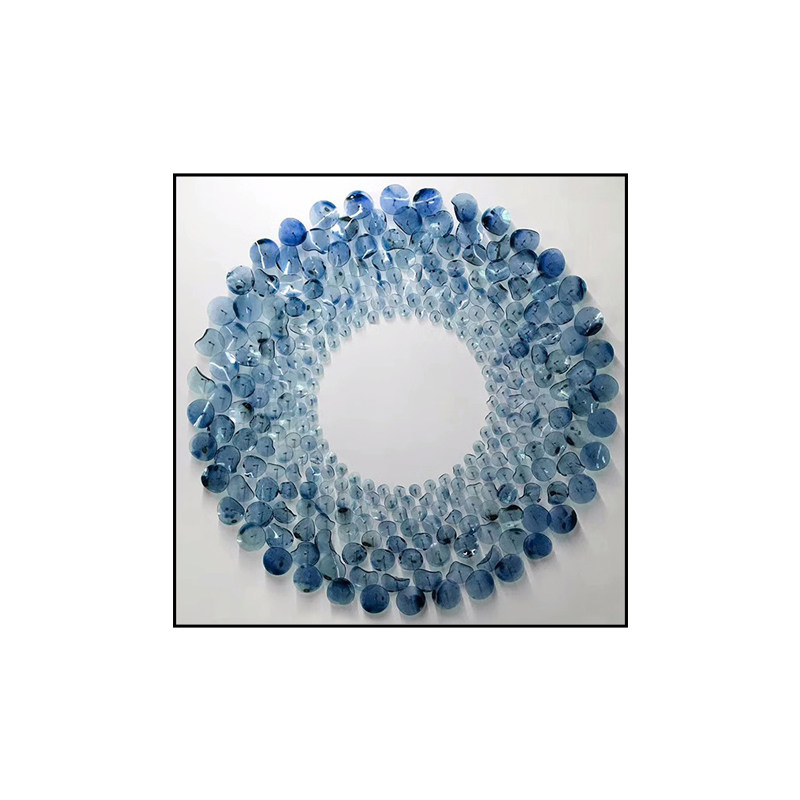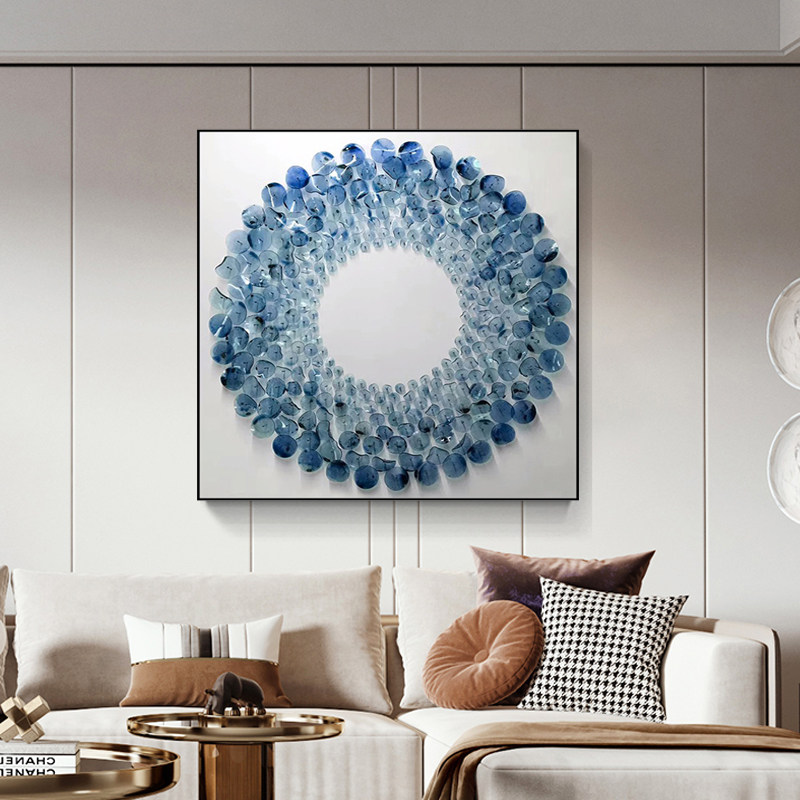 This circular three-dimensional acrylic mural is a vivid footnote to modern spatial aesthetics. Set against a minimalist white frame, the main body is composed of gradient blue acrylic sheets layered and spliced, transitioning from light translucent cyan-blue to deep sapphire blue. The circular structure spreads like ripples, and the three-dimensional material refracts flowing light and shadow under illumination—retaining the transparency of glass while possessing the lightness and toughness of acrylic.