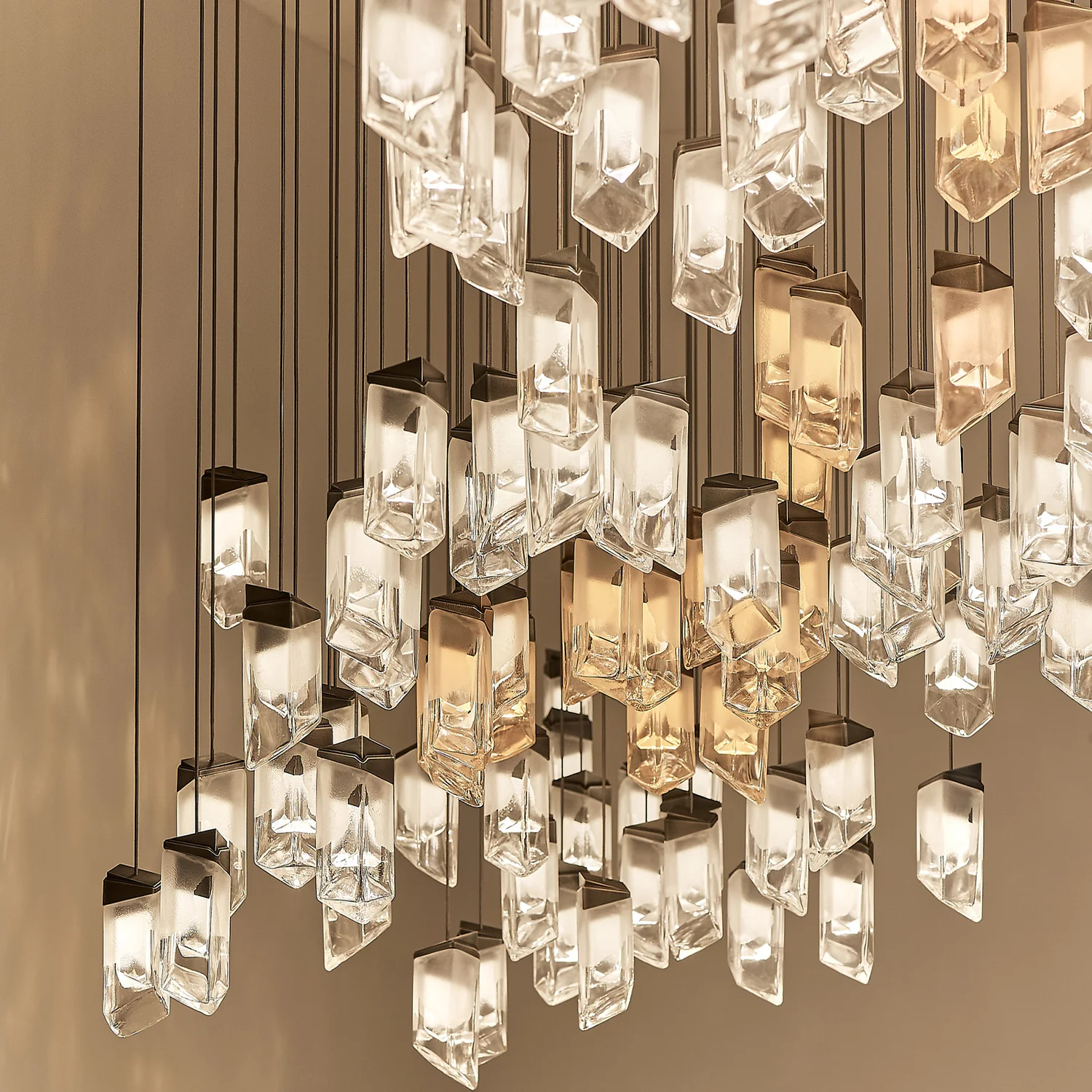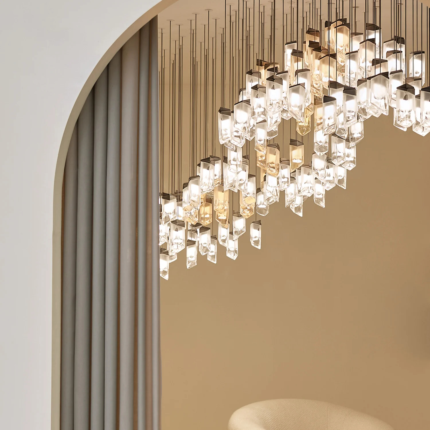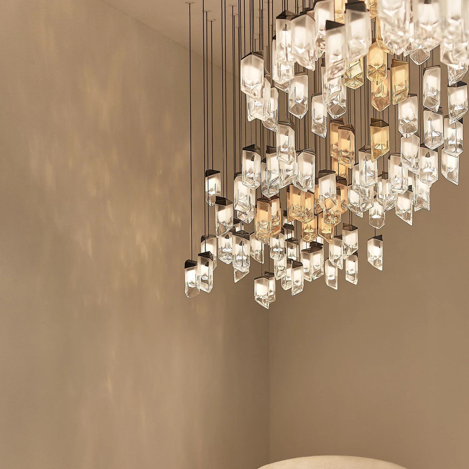 This fixture is a modern architectural statement—combining geometric glass elements with dynamic suspension to transform ceilings into a luminous, layered installation.