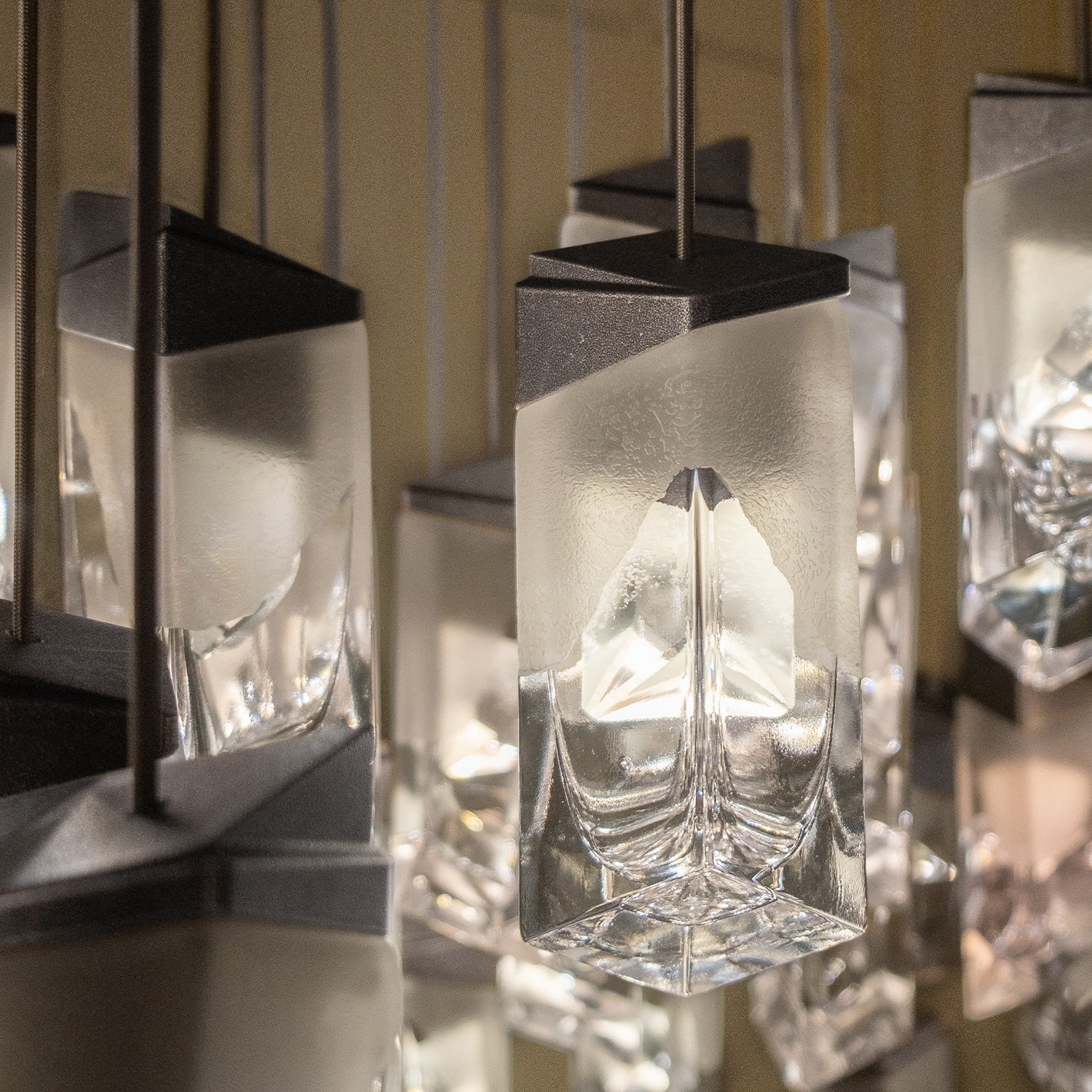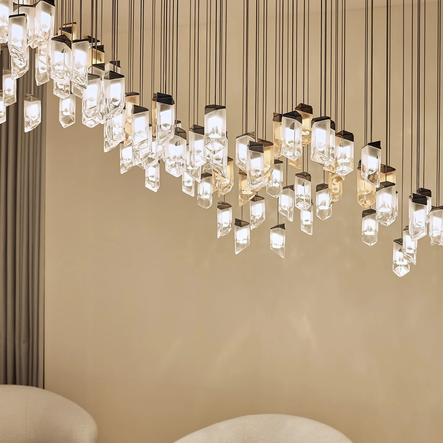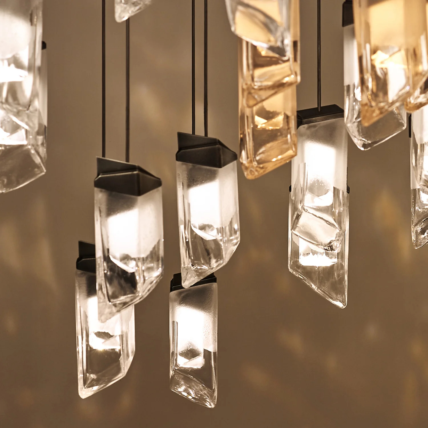 This fixture is a modern architectural statement—combining geometric glass elements with dynamic suspension to transform ceilings into a luminous, layered installation.