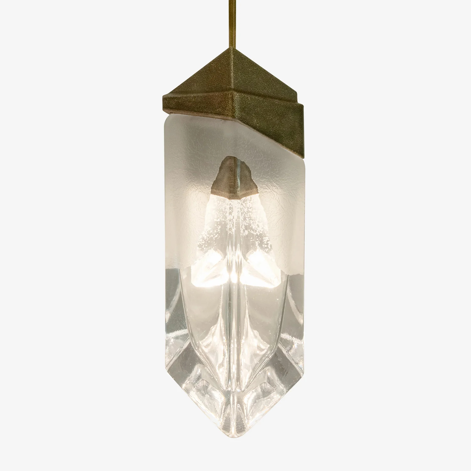 - Composed of clear, rectangular glass prisms (with polished edges) and metallic suspension rods.