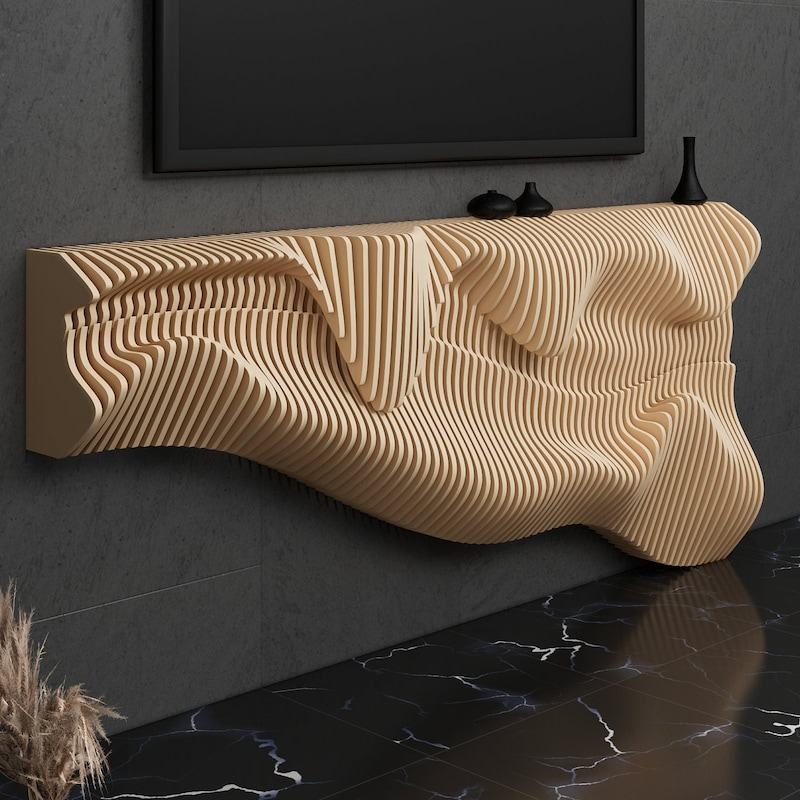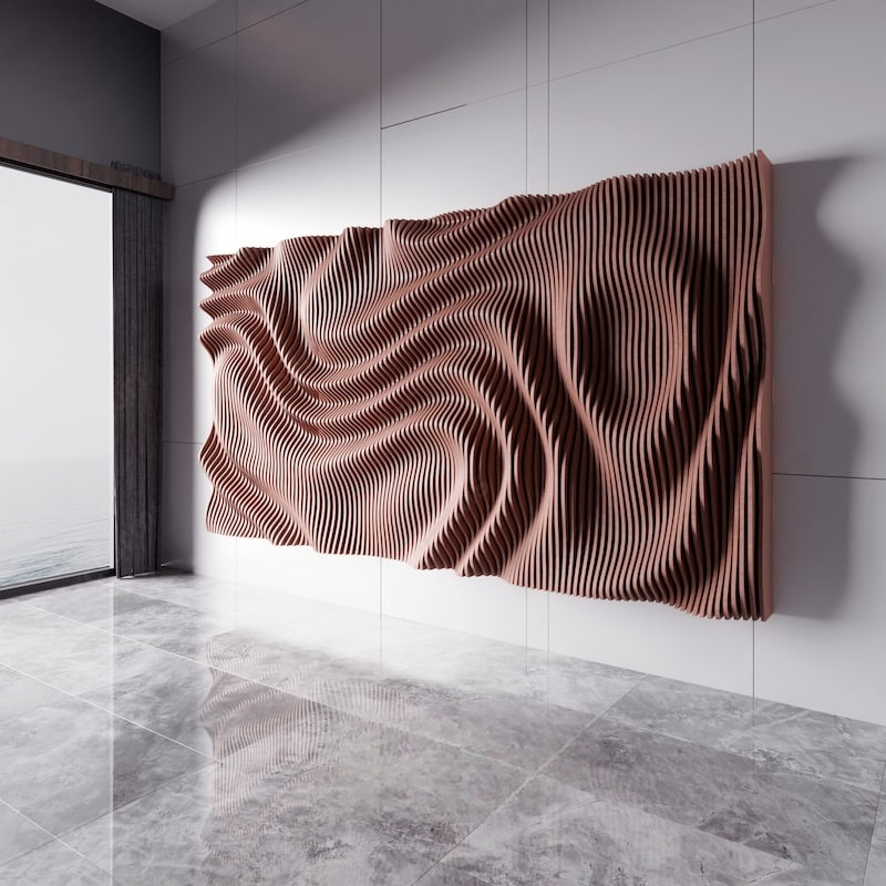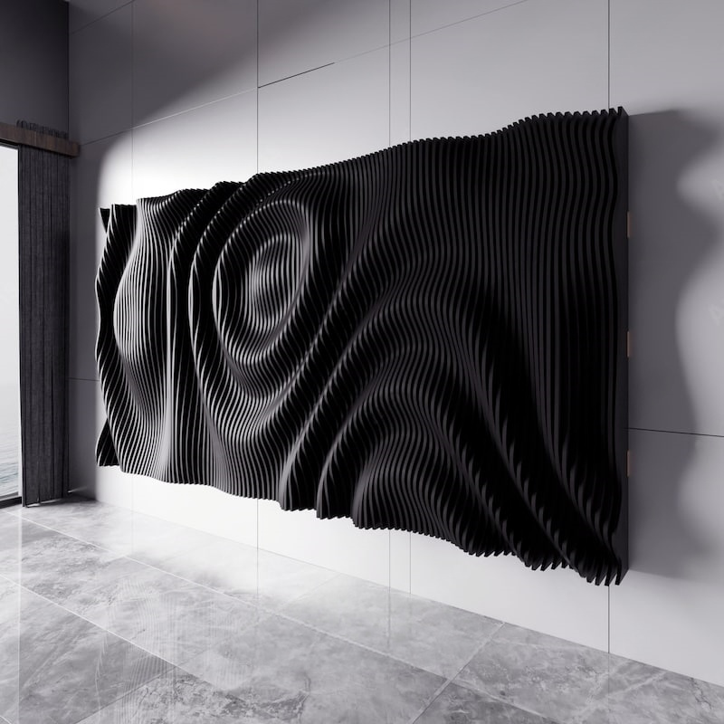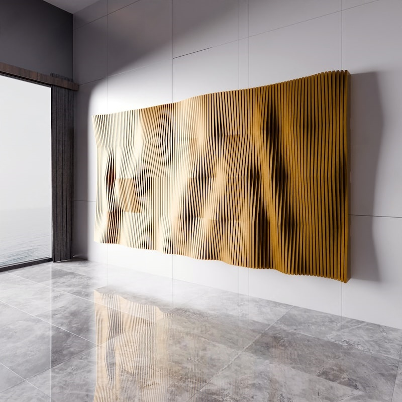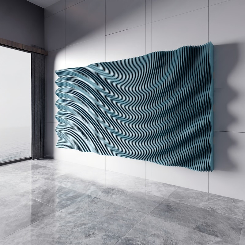 Its dense corrugated structure can help optimize the spatial acoustic effect, fitting functional areas such as modern living rooms and home theaters; the deep blue tone and matte texture not only echo the calm tone of minimalist spaces but also inject dynamic tension into the space through the light and shadow changes of the three-dimensional corrugations (presenting alternating light and dark blue layers with different light angles). The horizontal extension form of the installation perfectly fills the blank of large walls—it is both the visual main scene of the wall and can achieve the unity of function and aesthetics through the combination of material and form.