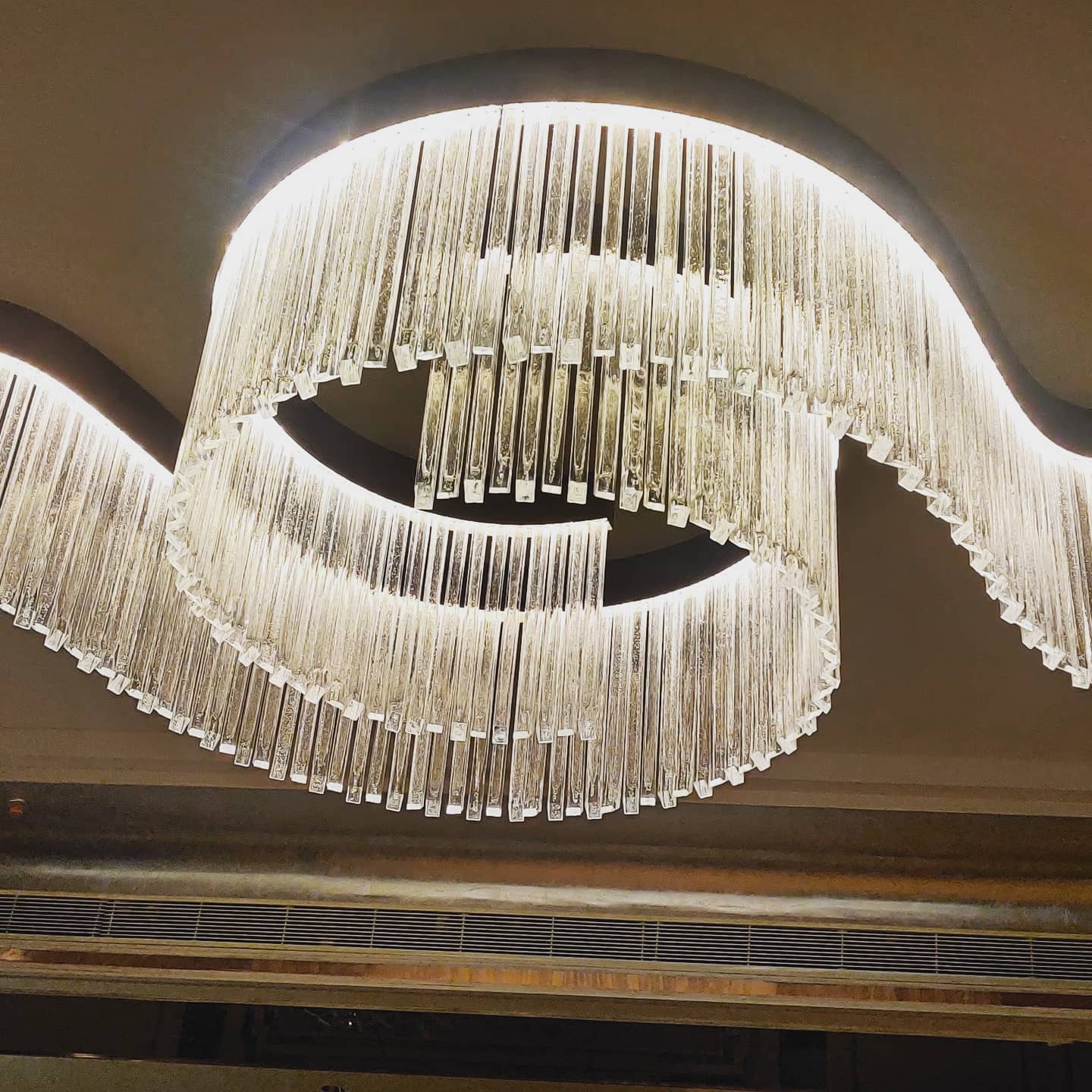 Crafted from hand-blown bubble crystal glass (each strand embedded with delicate air bubbles that catch and diffuse light), the chandelier features overlapping circular tiers: each ring drapes in cascading glass strands, forming a layered halo that evokes a misty celestial ring. The bubble glass’s subtle texture softens its sparkle: when lit, it glows with a warm, diffused radiance (like sunlight through frosted water), casting gentle, blurry patterns across the room’s warm wood and marble surfaces (elevating this sophisticated lounge). Unlit, the clear bubble strands catch ambient light, appearing as a weightless, cloud-like sculpture—opulent yet uncluttered.