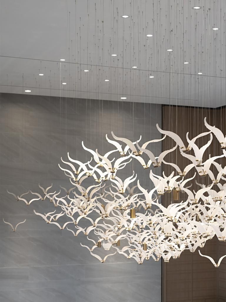 Designed for high-ceilinged, modern interiors (boutique hotel lobbies, upscale commercial spaces), it balances drama and restraint: the dense wing cluster feels intentional, yet the white glass avoids visual heaviness. Its neutral palette complements dark wood, metallic accents, and minimalist decor, acting as a focal point that anchors the space without overwhelming it.