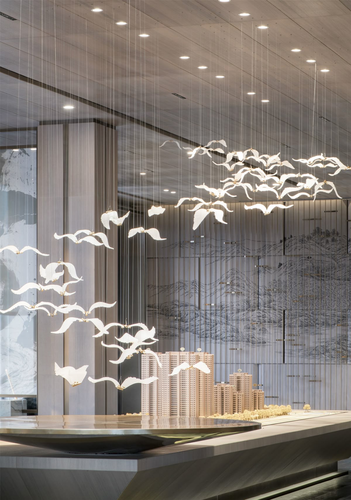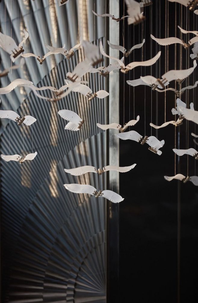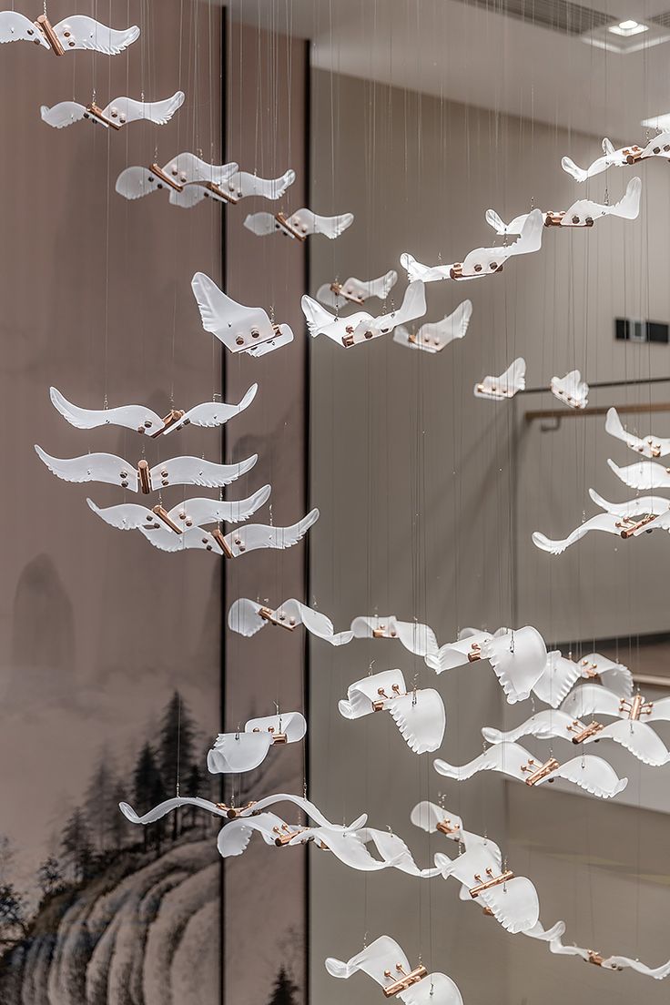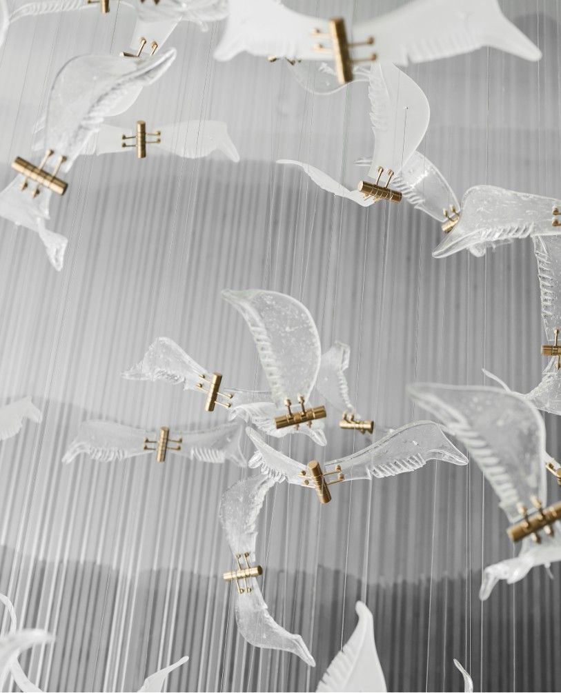 Crafted from matte-finish white glass (shaped into sleek, aerodynamic wing forms), each piece hangs at staggered lengths, clustered to evoke a flock of birds mid-ascent. The glass’s soft opacity diffuses light gently: when lit, the wings glow with a warm, ethereal hue, casting delicate, feather-like shadows across the room’s dark, textured surfaces (elevating this contemporary luxury space). Unlit, they stand as a crisp, monochromatic sculpture—sharp yet soft, bold yet airy.