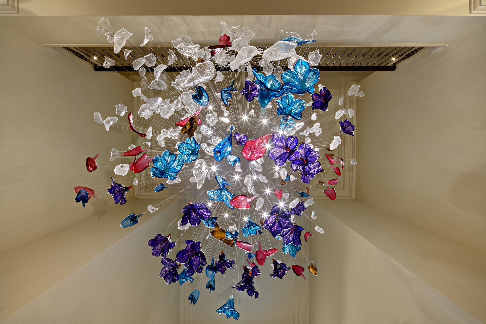 More than decor, it’s a wearable art installation: a cascade of glass blooms that turns ordinary high ceilings into extraordinary, color-drenched sanctuaries.