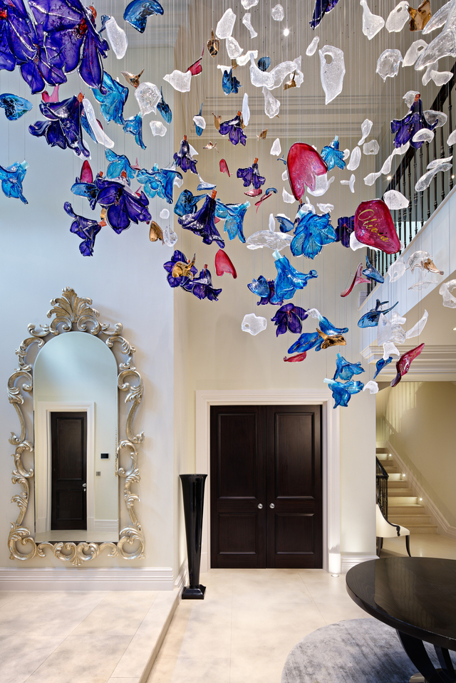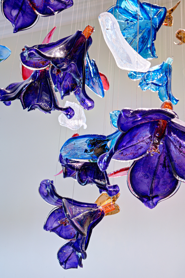 Crafted from vibrant, translucent glass (in jewel tones: cobalt blue, amethyst purple, ruby red, and frosted white), each piece is shaped into a unique, petal-like bloom or leaf, clustered to evoke a wind-tousled bouquet. The glass’s inherent translucency softens the bold colors: when lit, each bloom glows with a saturated, diffused warmth, casting prismatic streaks of blue, purple, and red across walls (elevating this classic-contemporary double-height entryway). Unlit, the colorful glass forms a sculptural tapestry—vibrant yet airy, opulent yet playful.