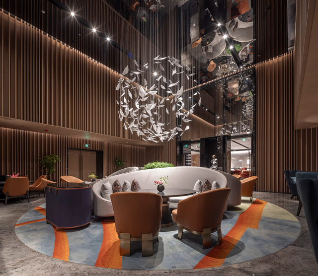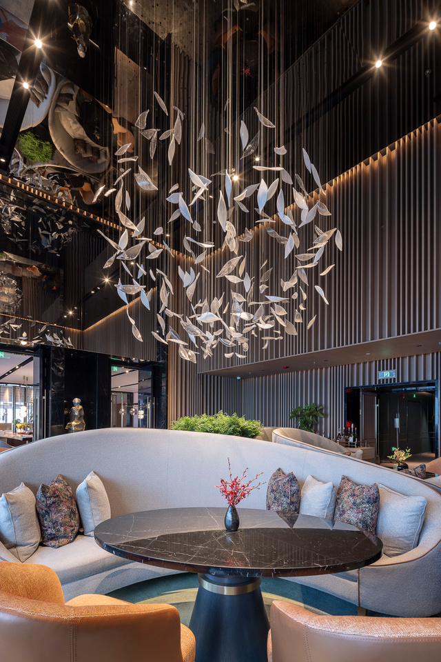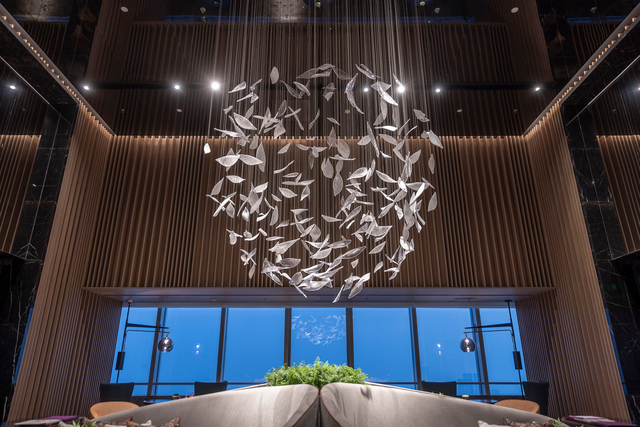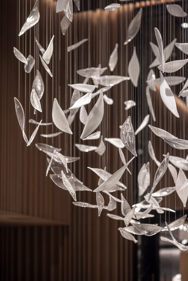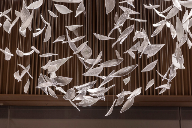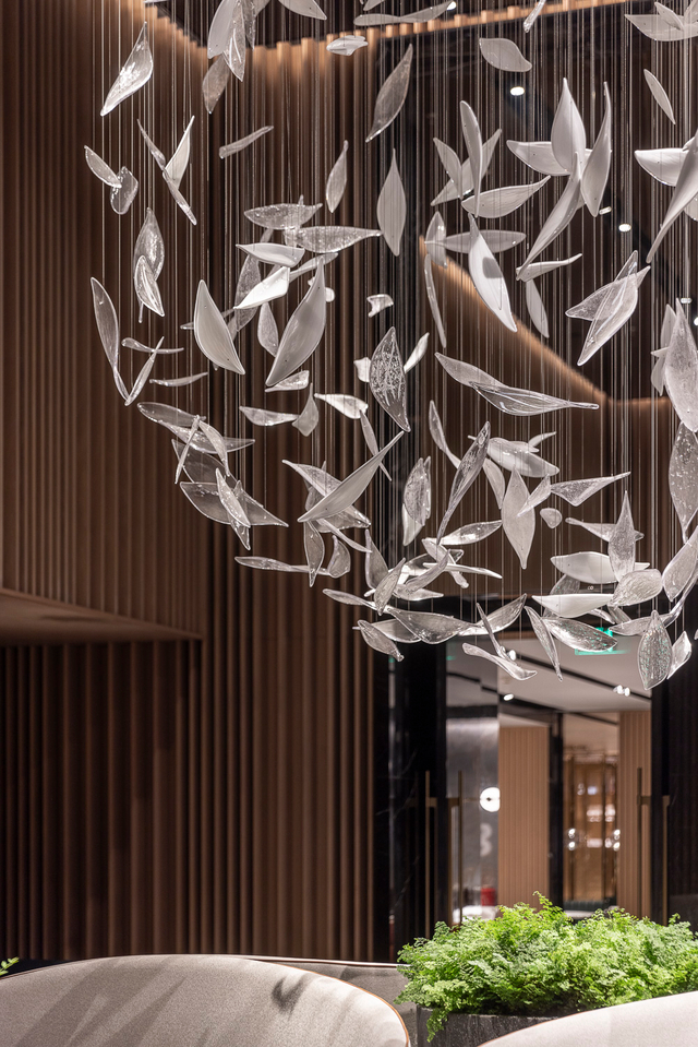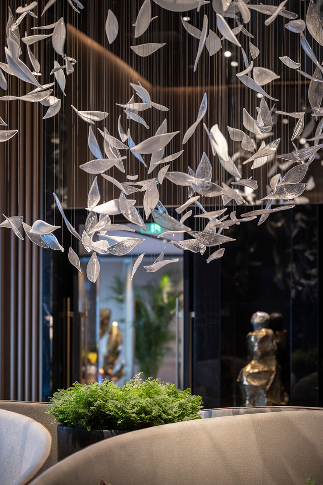 Crafted from polished silver-tone glass (mimicking the sheen of frosted metal, with delicate leaf-shaped cuts that catch and scatter light), each piece hangs at staggered lengths, clustered to evoke a flock of leaves caught mid-breeze. The glass leaves’ subtle translucency softens their sharp metallic finish: when lit, they glow with a cool, diffused warmth, casting dappled silver patterns across the room’s dark wood and textured walls (elevating this sophisticated lounge). Unlit, they shimmer like a suspended constellation of pale foliage, adding quiet drama without overwhelming the moody interior.