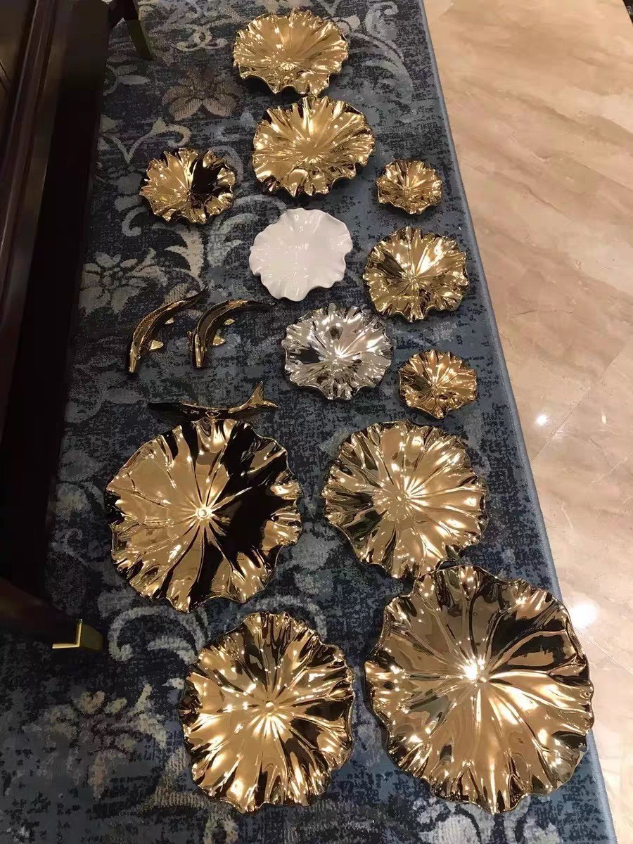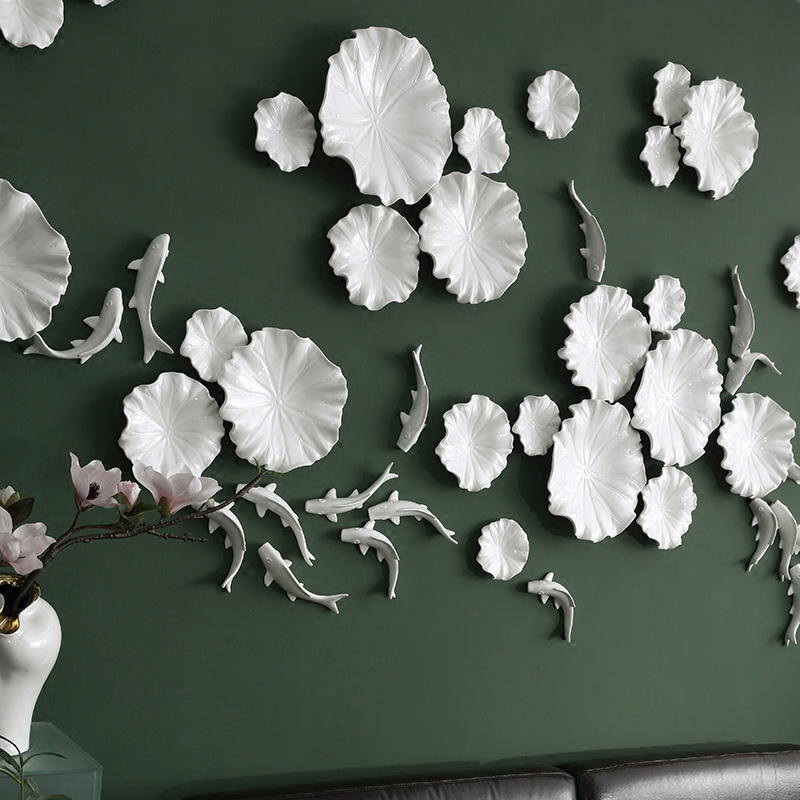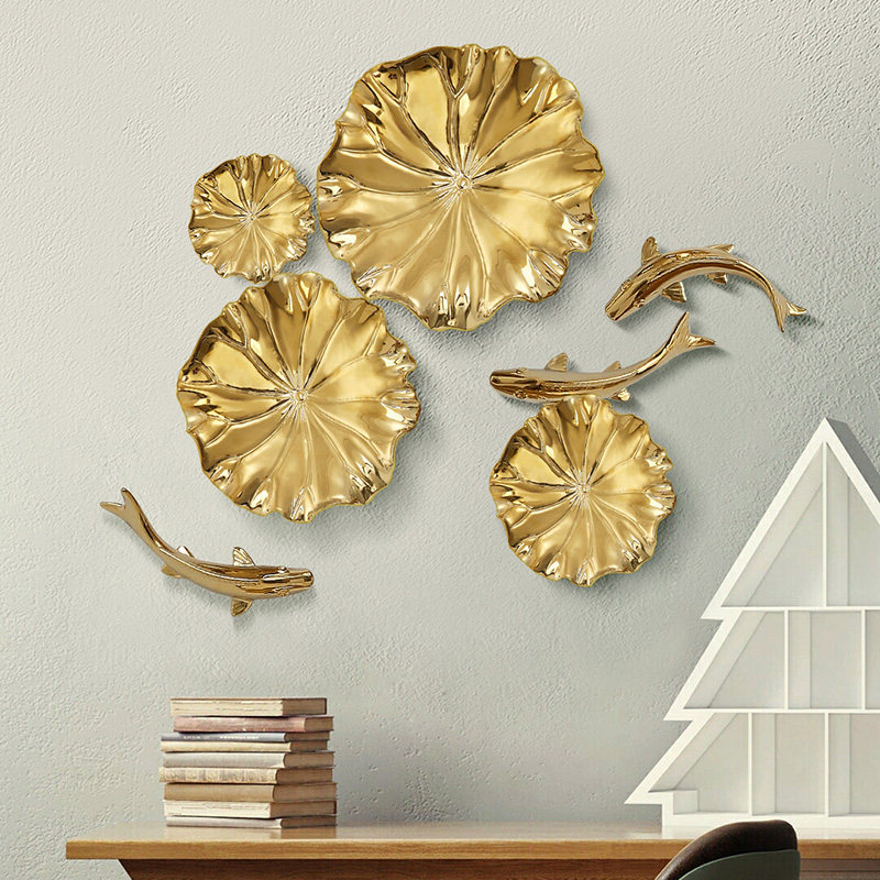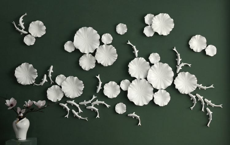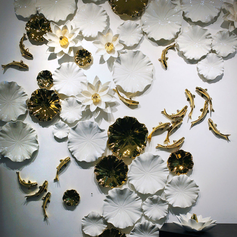 This wall installation takes "golden shadow in lotus pond" as its design imagery, integrating white glaze-textured lotus leaf modules with gilded decorations (lotus leaves, vines, fish) to replicate the vibrant natural scene of a lotus pond. It combines Eastern aesthetic conception with modern decorative texture, fitting new Chinese style, light luxury Chinese style living rooms or leisure spaces.