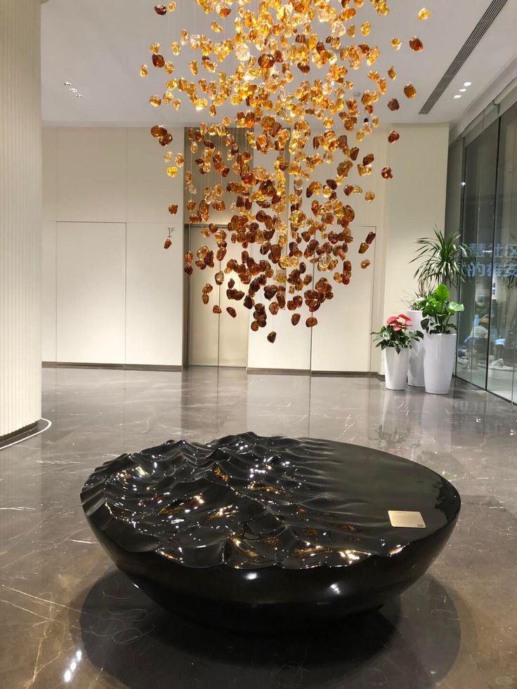 Crafted from two finishes of hand-cut glass: rich amber (mimicking honeyed gemstones, with warm undertones that catch light like sunset) and crisp clear (prismatic and bright, amplifying the glow of its amber neighbors). The stones hang at staggered lengths in a sweeping, cloud-like cluster—some amber, some clear, blended to evoke a harvest of golden leaves or a starry sky streaked with twilight. When lit, the amber glass radiates a soft, honeyed warmth, while the clear stones refract light into sharp, sparkling highlights; together, they cast dappled, golden patterns across walls (elevating this modern, warm-toned venue). Unlit, the mix of amber and clear creates a layered, sculptural statement—warm yet airy, opulent yet uncluttered.