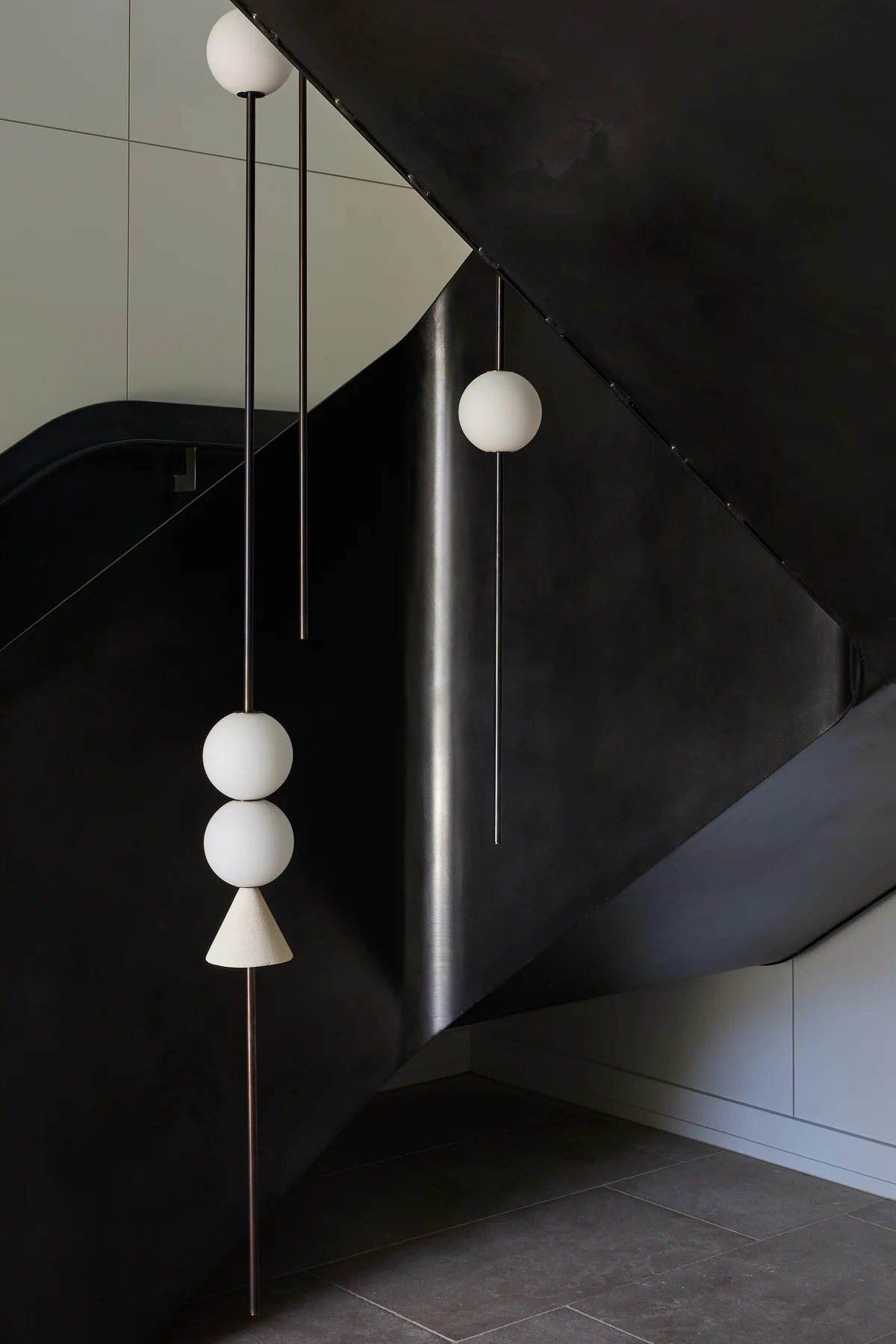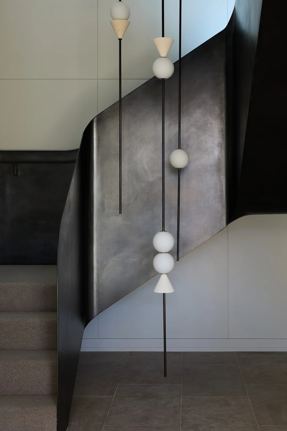 - Structural Layout: Suspended in multiple vertical linear groups, with spheres and conical elements arranged in staggered combinations. The varying lengths of the rods align with the stairwell’s vertical flow, creating a dynamic visual rhythm.