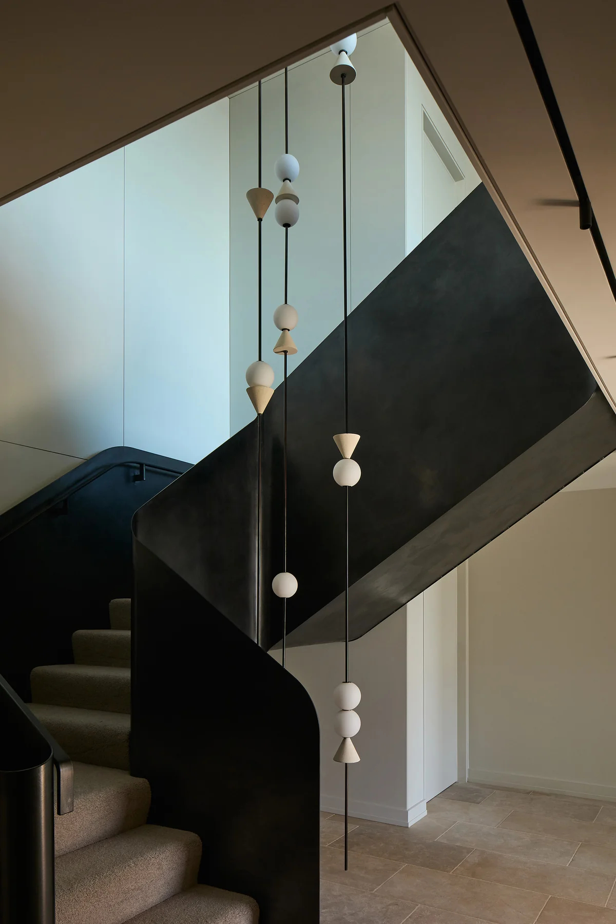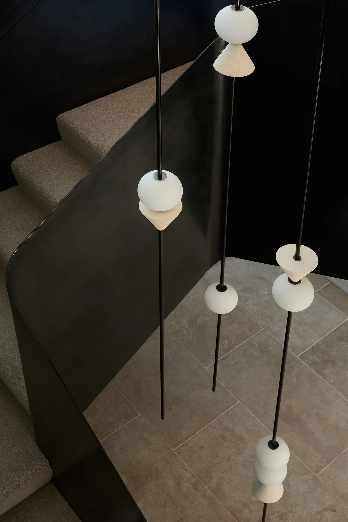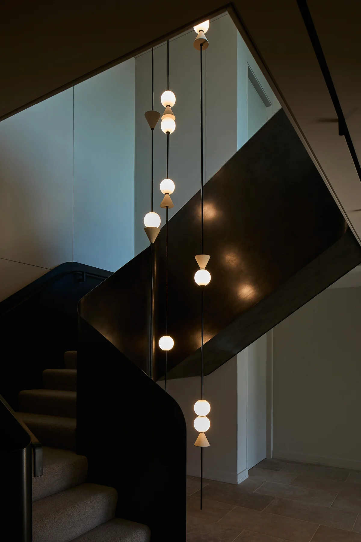 - Light Performance: The frosted glass spheres emit warm, uniform diffused light, avoiding glare while illuminating the stair steps and surrounding surfaces. The contrast between the black rods and bright light sources strengthens the fixture’s modern minimalist style.