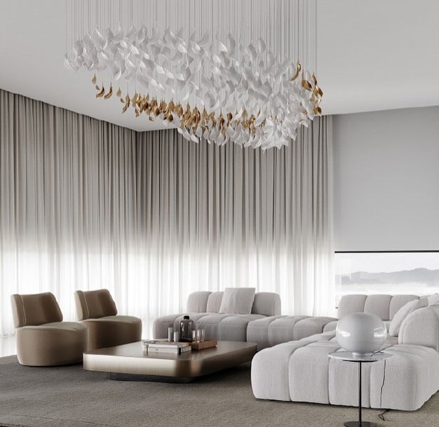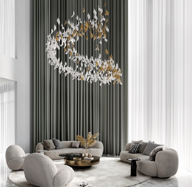 Designed for mood-driven interiors, it balances drama and softness: the sweeping wave feels bold, yet the ceramic material keeps it from overwhelming the room. The white-gold palette complements dark, luxe finishes (deep curtains, warm wood) while adding a luminous focal point, making it ideal for boutique hotels, high-end dining rooms, or sophisticated living spaces.