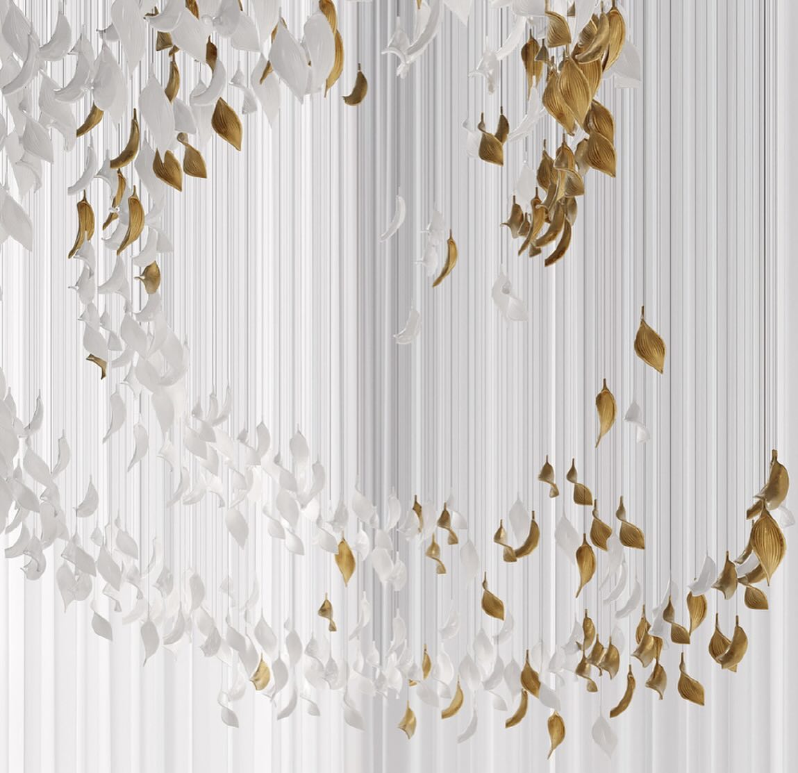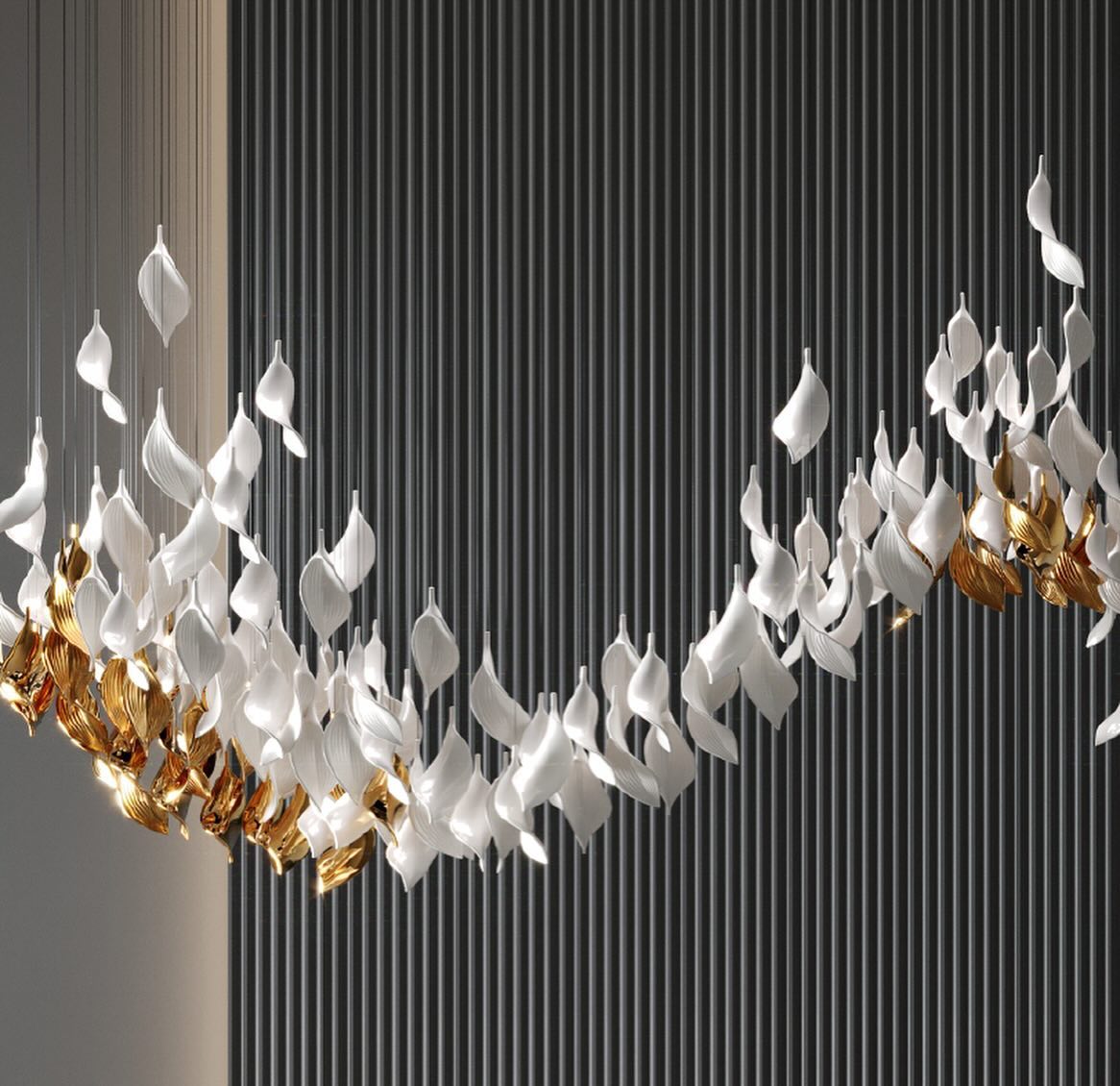 Crafted from hand-glazed ceramic (a material prized for its matte warmth), each piece is a petal-shaped element in dual finishes: soft ivory white (with a subtle, velvety texture that diffuses light) and lustrous gilded gold (polished to a rich sheen that catches ambient glow). The petals cluster in a sweeping, wave-like curve—longer at the edges, clustered tightly at the center—evoking a breeze-tousled bouquet frozen in motion. When lit, the white ceramic glows with a gentle, diffused warmth (perfect for intimate spaces like this moody, dark-curtained lounge), while the gold petals reflect light, casting gilded streaks that add depth to the shadowy backdrop. Unlit, the matte-sheen contrast creates a layered, organic statement—soft yet opulent, natural yet refined.