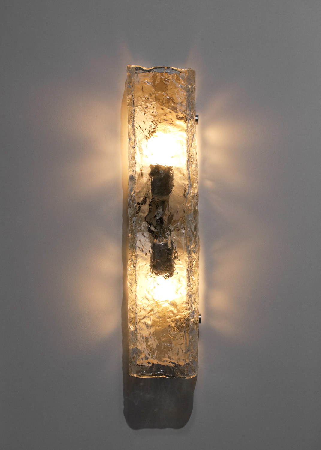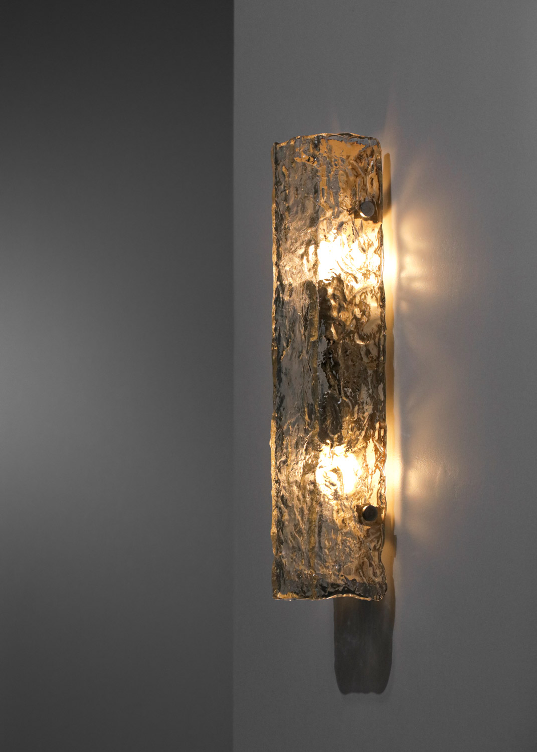 - Light Performance: The textured glass diffuses the built-in light sources, emitting a soft, warm glow that highlights the glass’s rough texture. The light also casts mottled, natural shadows on the wall, enhancing the space’s artistic ambiance.