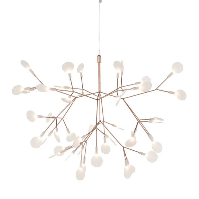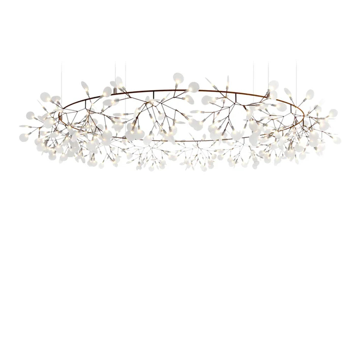 This floral branch ring chandelier redefines ceiling lighting as a delicate, nature-inspired focal point, crafted from brushed copper-finished metal branches (shaped into a circular frame) and mini frosted acrylic globes (lightweight, diffusion-optimized for soft glow). It emits a warm 2700K light, diffused by the acrylic to create a gentle, layered ambient atmosphere.
