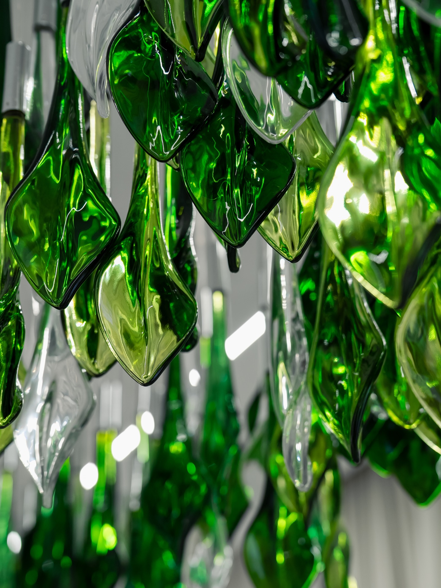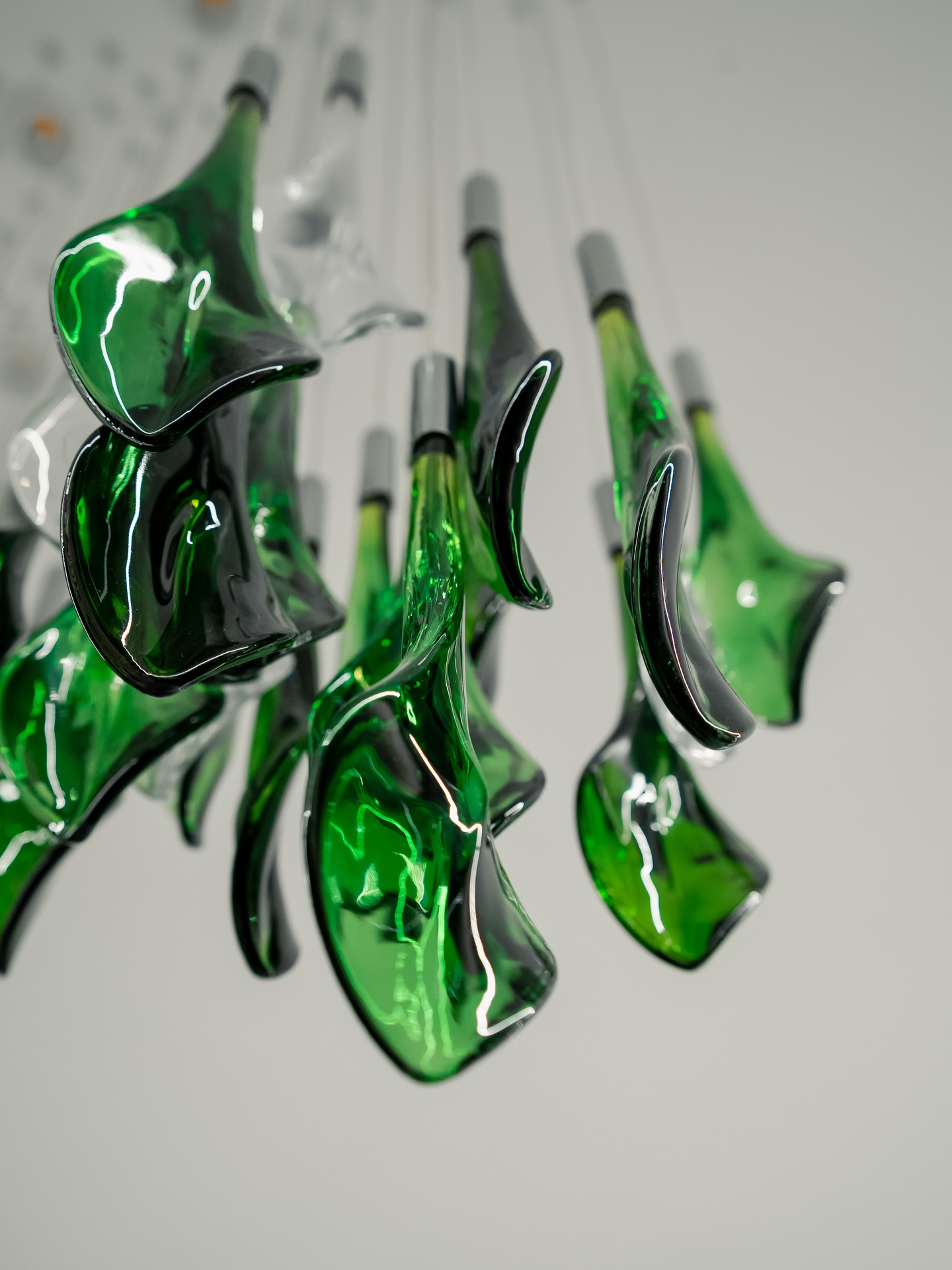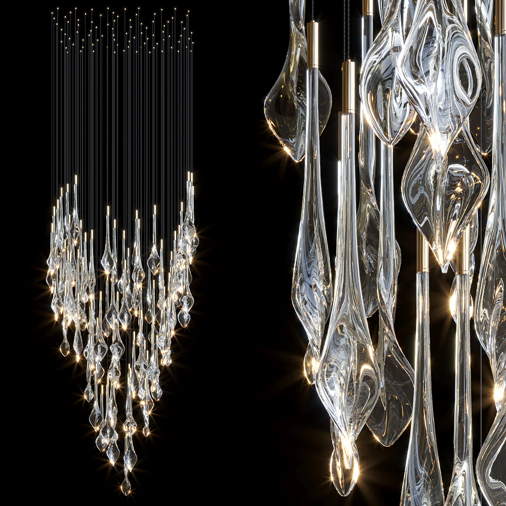 This fixture weaves nature’s grace into modern design—an ethereal cascade of glass foliage that turns high ceilings into a living tapestry of light.