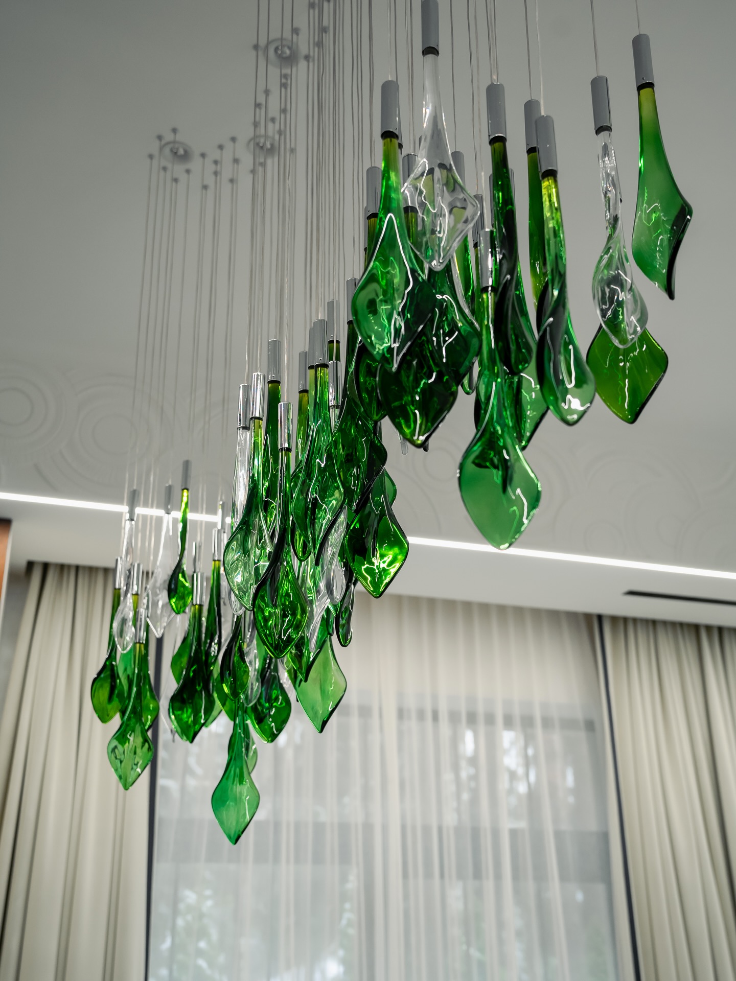 Each piece is a handcrafted clear glass leaf: its delicate veins and curved silhouette mimic real foliage, while the tapered tail finishes in polished stainless steel (adding a sleek, industrial contrast to the organic form). Suspended in a layered, downward-draping cluster, the leaves hang at staggered lengths—longer at the edges, shorter at the center—mirroring a bough swaying with foliage. When lit, the transparent glass glows softly, diffusing light through its veins like sunlight through a canopy, while the stainless steel tails catch glints of brightness. The effect elevates this contemporary double-height lounge (with muted gray tones) by blending soft, natural charm with sharp, modern accents.