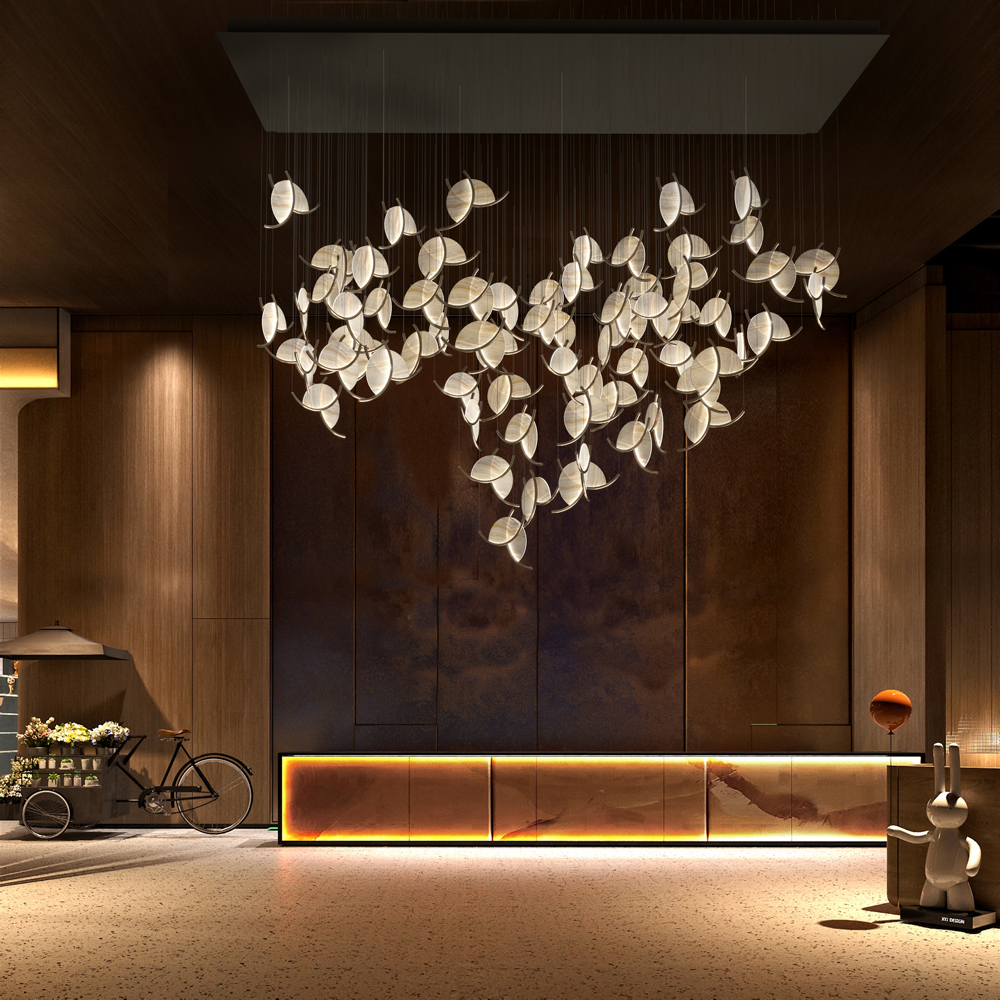 Adjustable suspension wires (2–4m) fit high commercial ceilings, and 110–240V compatibility suits global installations. The lightweight acrylic-metal structure ensures safe mounting, while 25,000-hour LEDs reduce maintenance. More than a light source, it’s a spatial art piece: the petal cluster adds natural rhythm, proving organic design can feel both elegant and dynamic.
