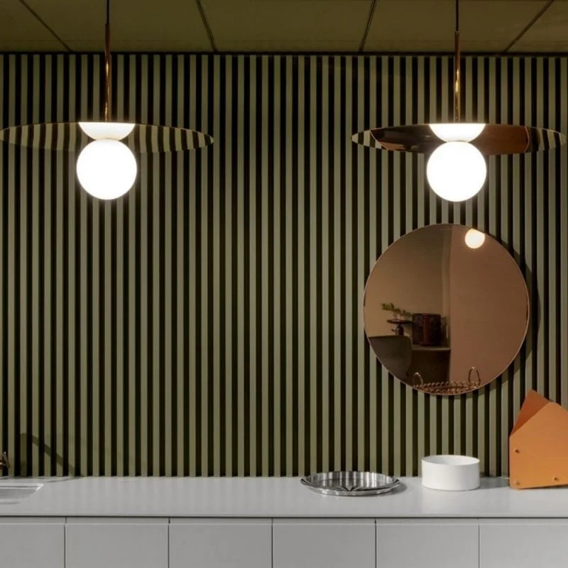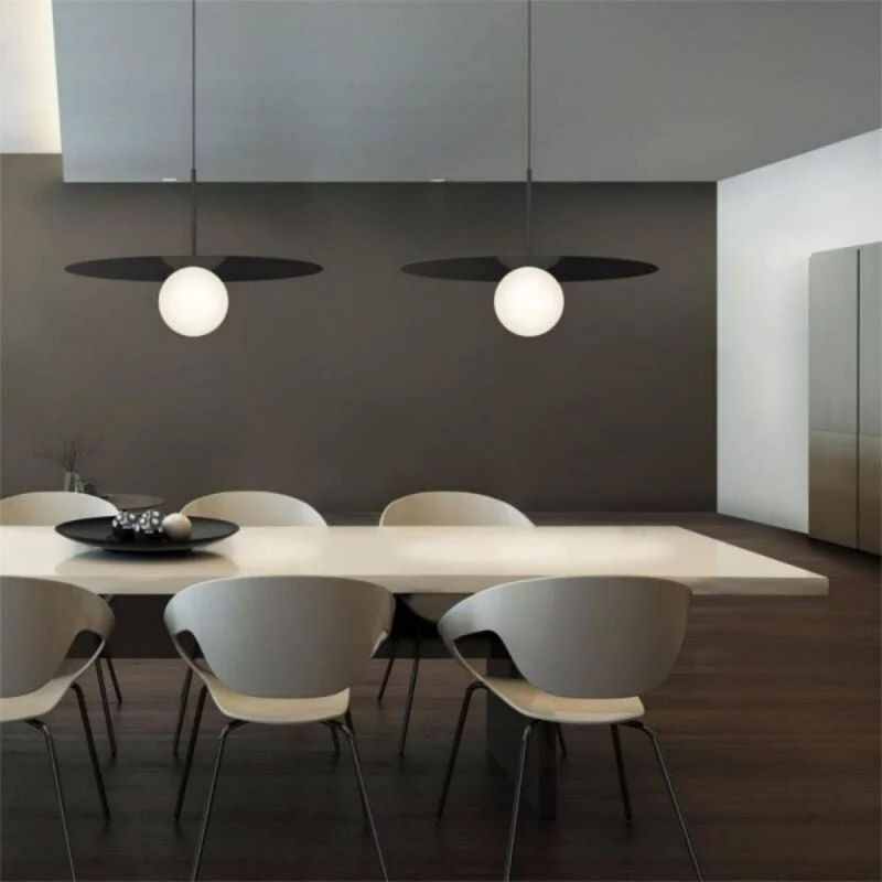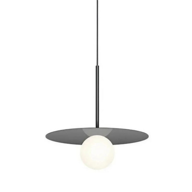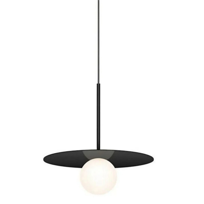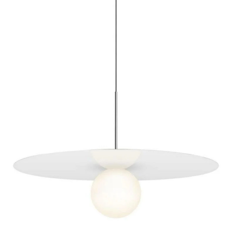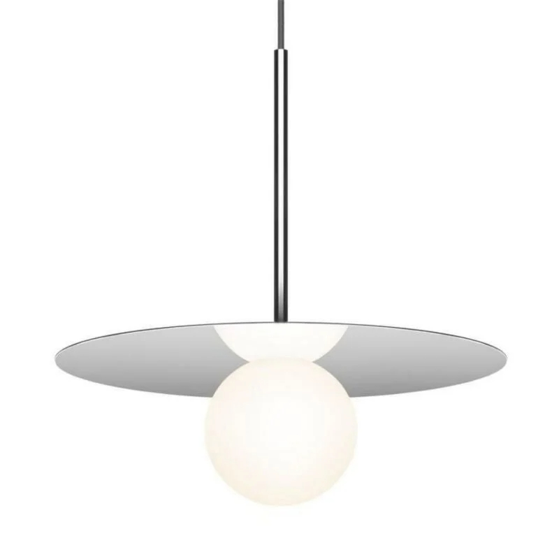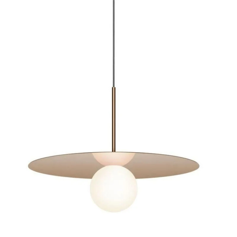 This set of disc-and-sphere pendant lights redefines commercial accent lighting as a retro-modern focal point, crafted from frosted glass discs (light-diffusing) and opal glass spheres (soft glow), paired with brushed brass metal accents (warm tonal contrast). It emits a 2800K warm glow, balancing vintage charm with contemporary simplicity.