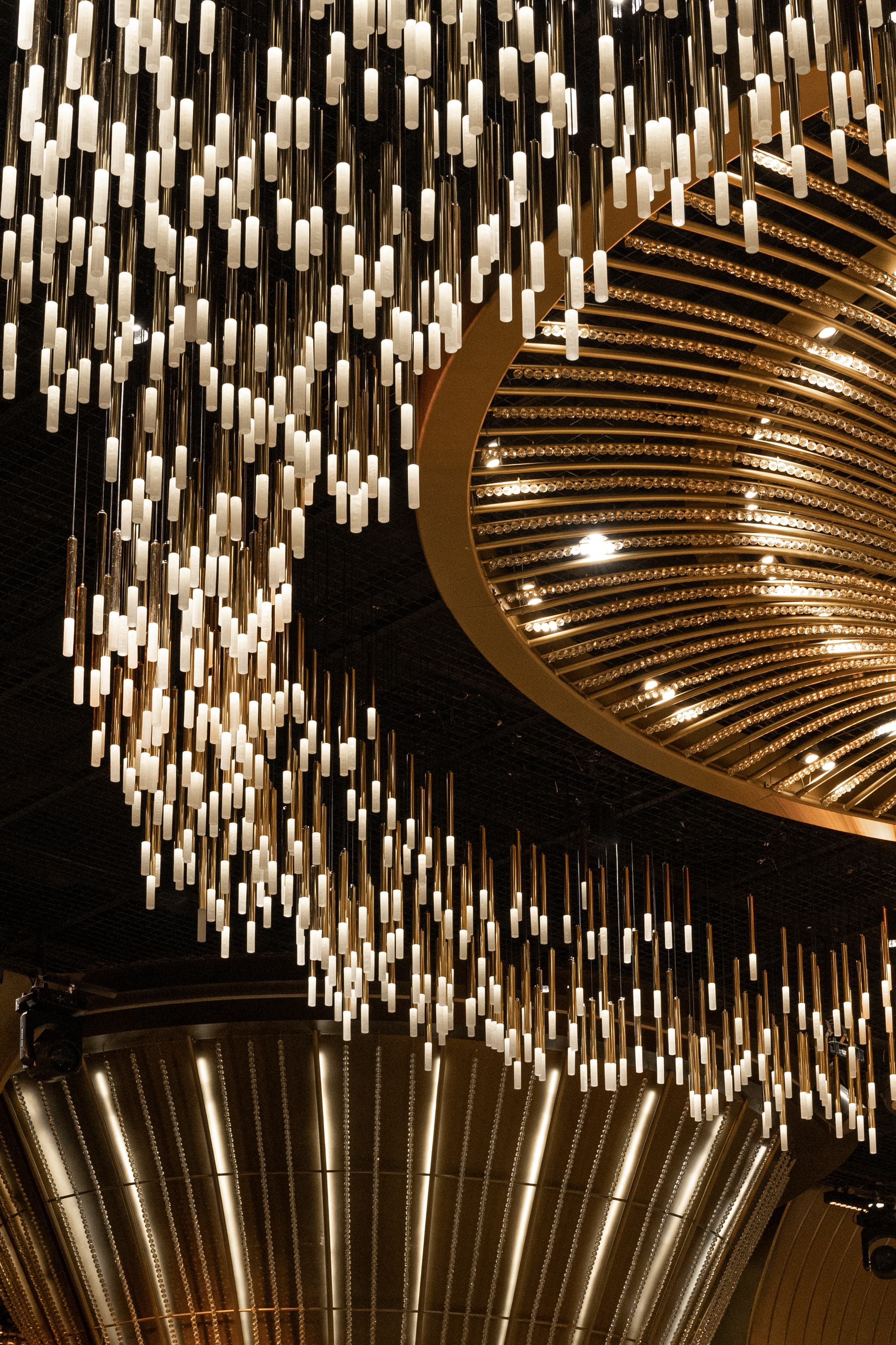 This linear LED canopy chandelier redefines commercial lighting as a sculptural focal point, crafted from matte black metal slats (formed into a curved, layered structure) and mini dimmable LED bulbs (cool 4000K white light, ideal for brightening public areas). It creates a dynamic, starry-sky effect that balances functionality with visual drama.