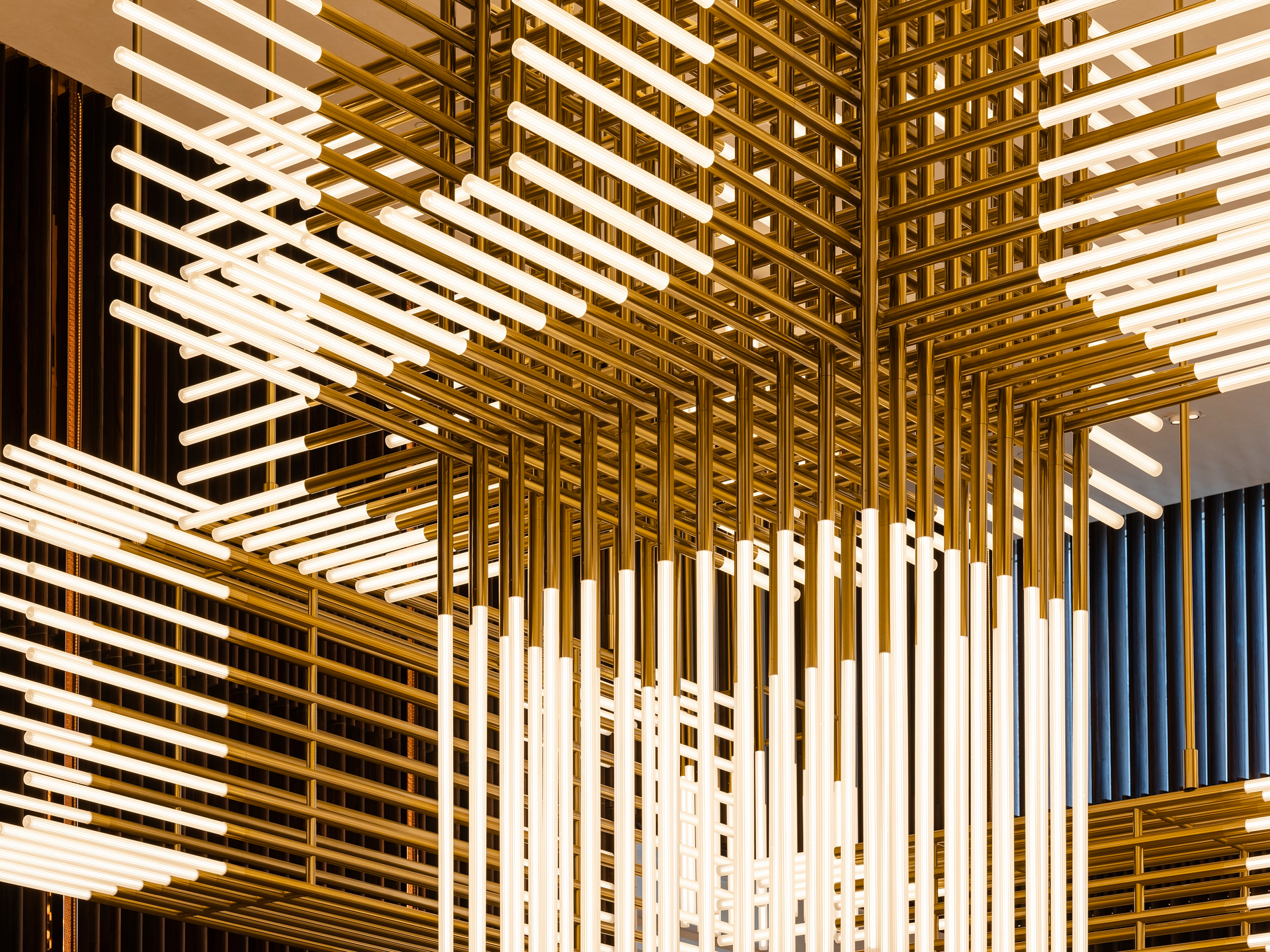 In terms of style, it belongs to modern light luxury style, with geometric rectangles as the core elements. It builds a sense of order and art through layered combinations. Warm light penetrates the light bars to form a soft halo, which fits the spatial tones such as modern luxury and new urban style.