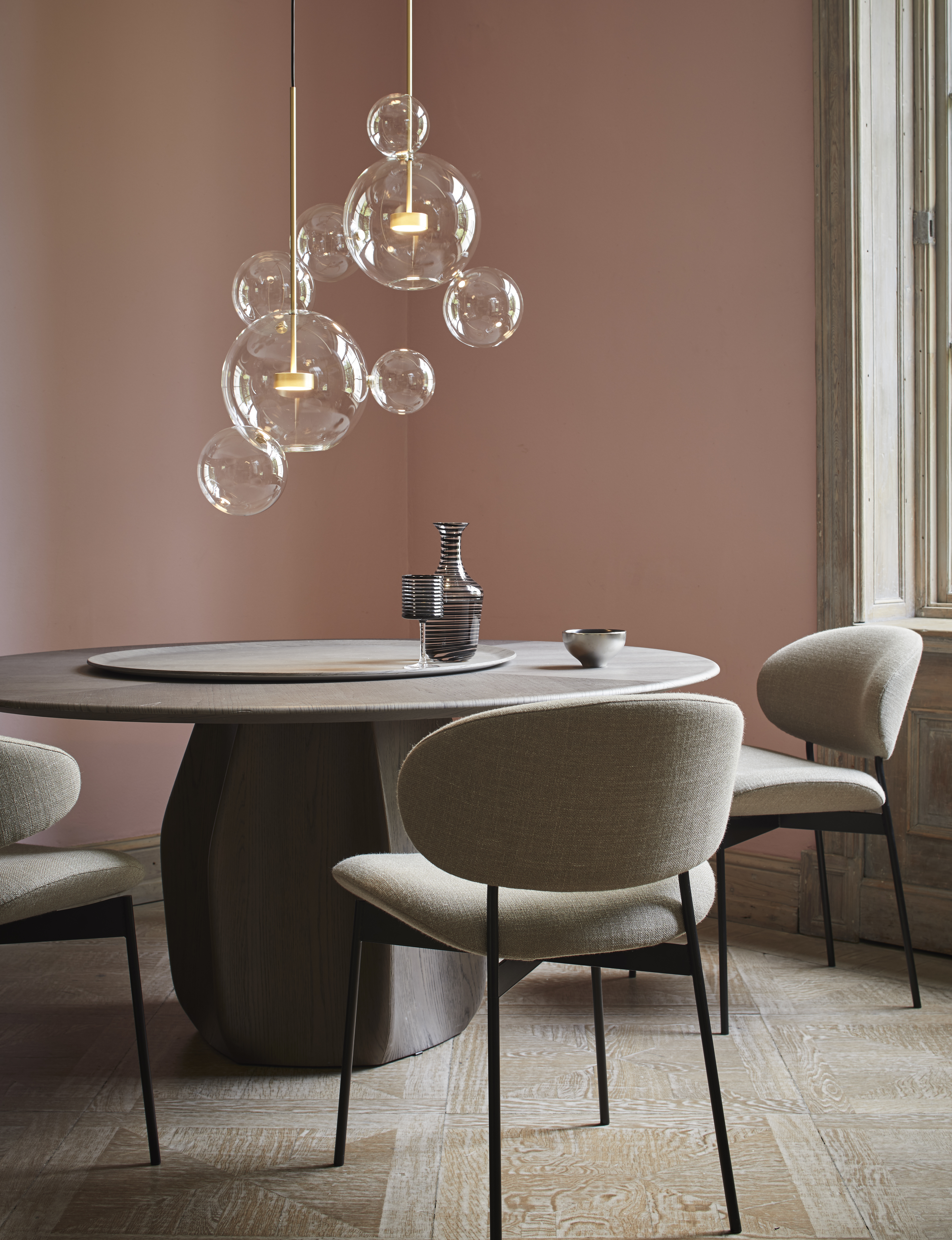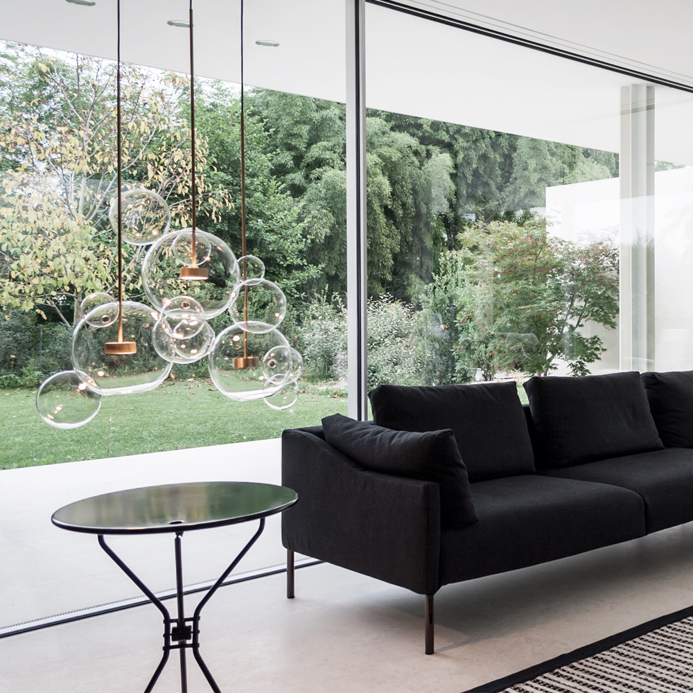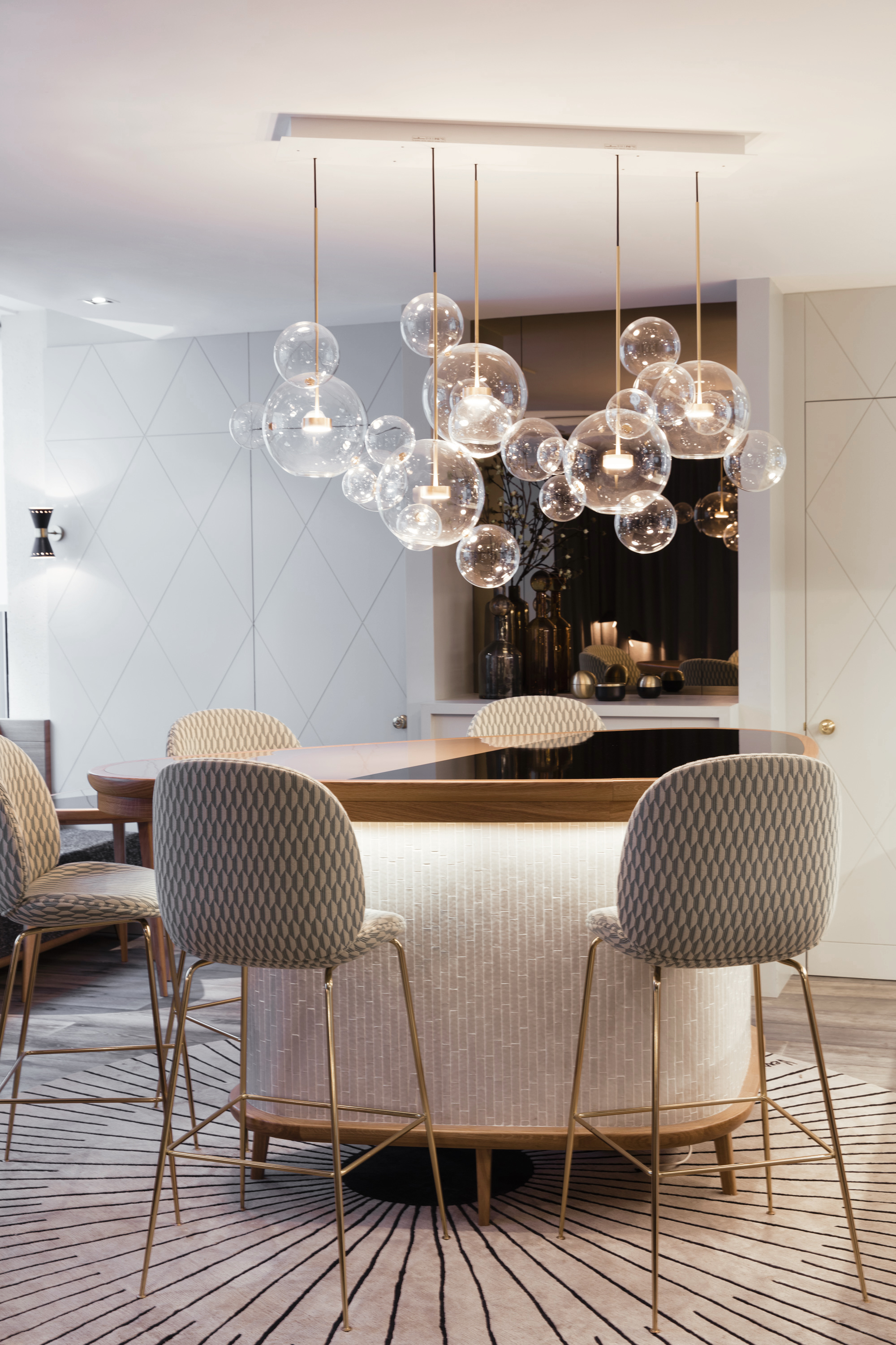 Crafted from hand-blown clear glass orbs (each with subtle, organic imperfections that celebrate artisanal craft) and finished with warm aged brass hardware, the chandelier clusters like a cascade of floating bubbles. The transparent spheres let light spill freely: when lit, the exposed bulbs glow through the glass, casting soft, diffused halos that soften formal interiors (like this gray-paneled dining room). Unlit, the orbs catch ambient light, shimmering like dewdrops against the rich brass accents.