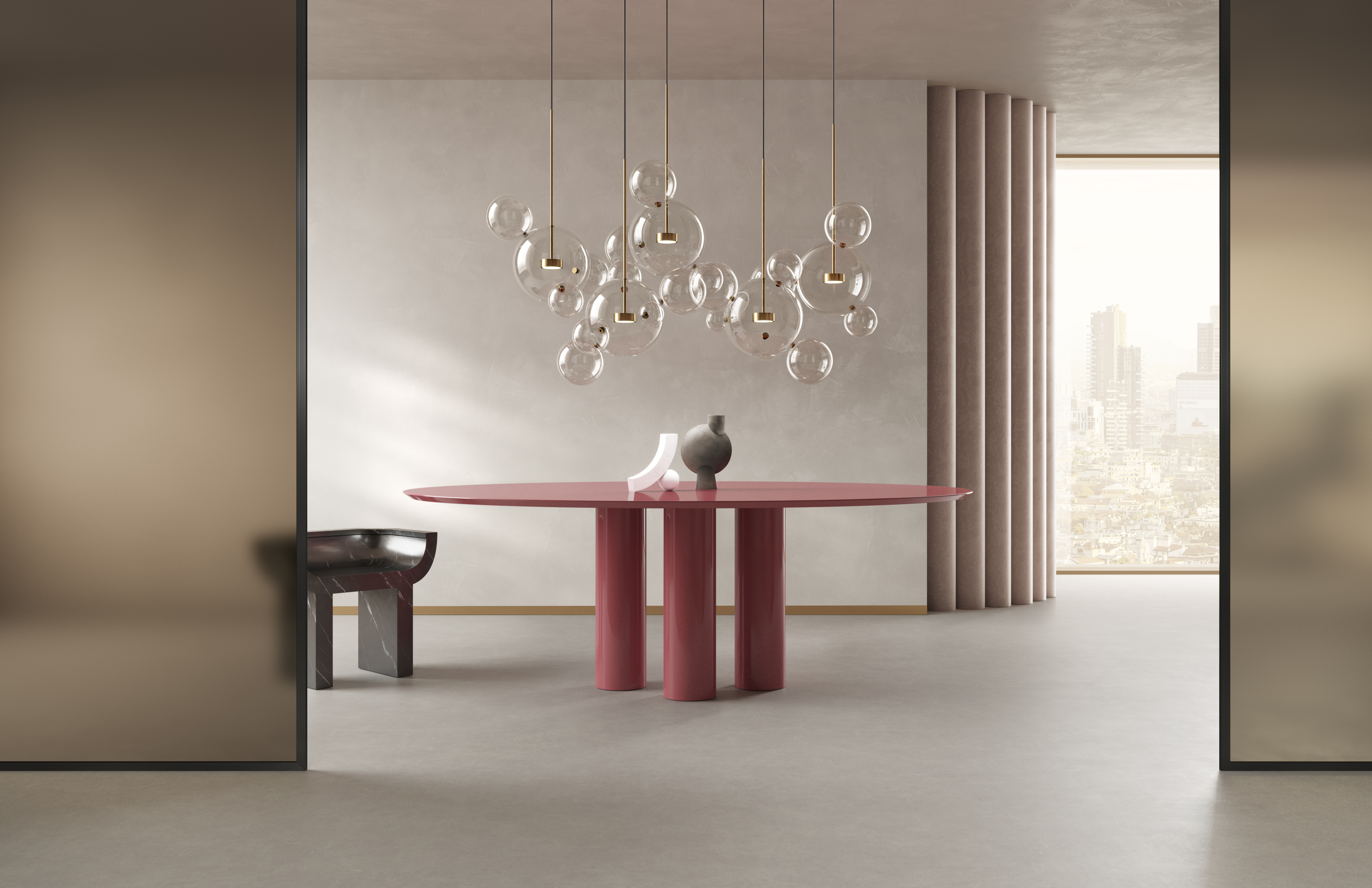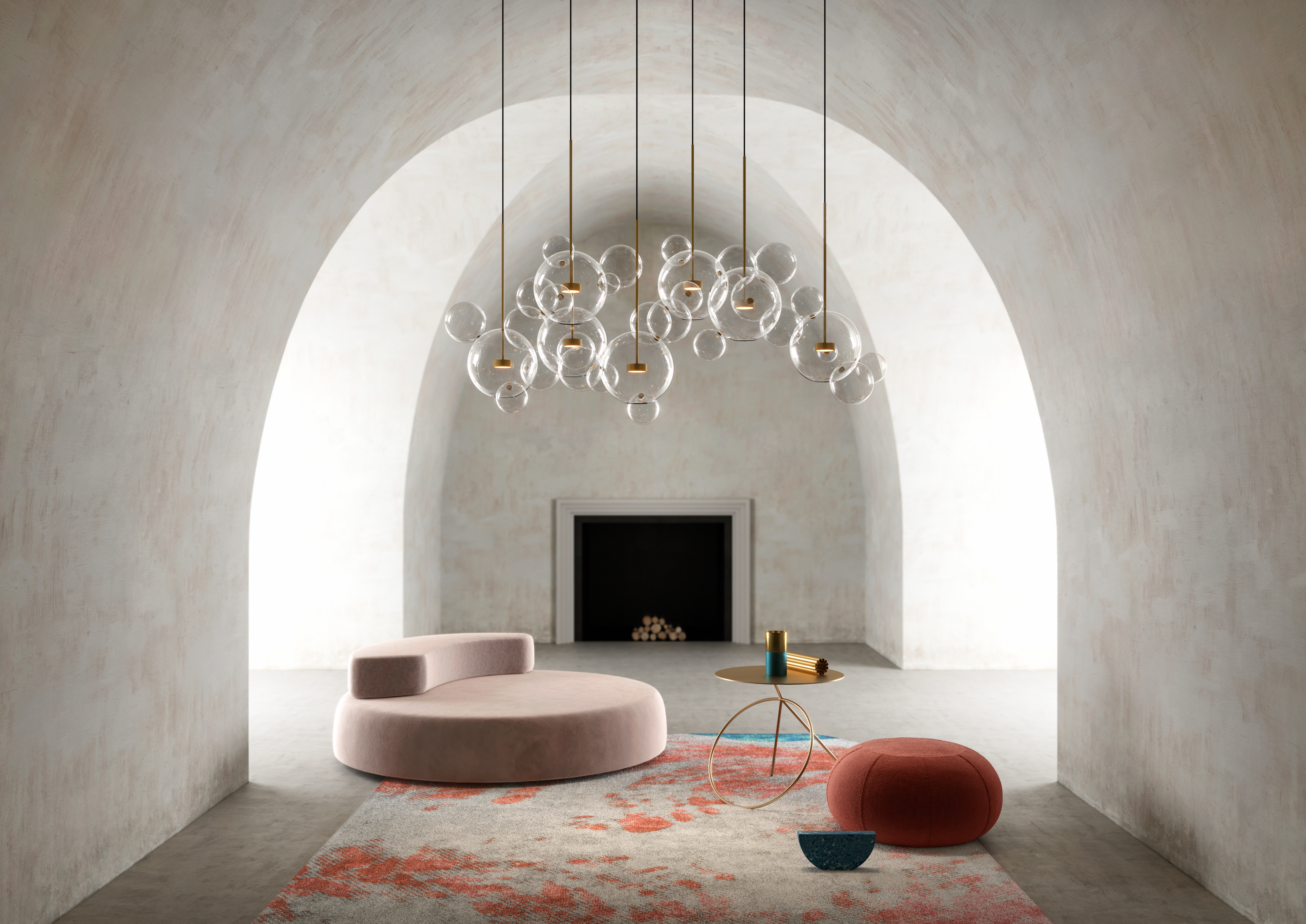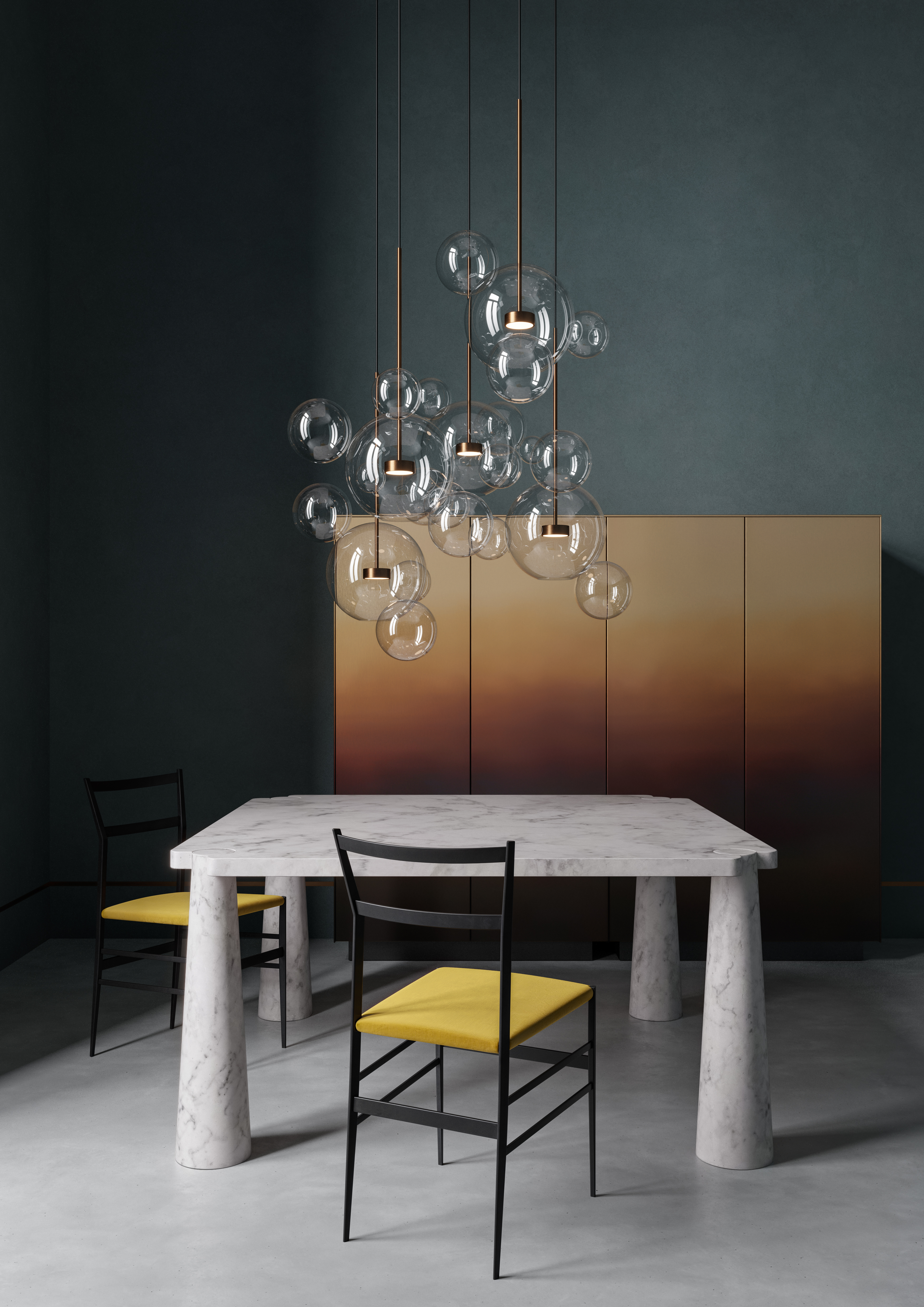 Crafted from hand-blown clear glass orbs (each with subtle, organic imperfections that celebrate artisanal craft) and finished with warm aged brass hardware, the chandelier clusters like a cascade of floating bubbles. The transparent spheres let light spill freely: when lit, the exposed bulbs glow through the glass, casting soft, diffused halos that soften formal interiors (like this gray-paneled dining room). Unlit, the orbs catch ambient light, shimmering like dewdrops against the rich brass accents.