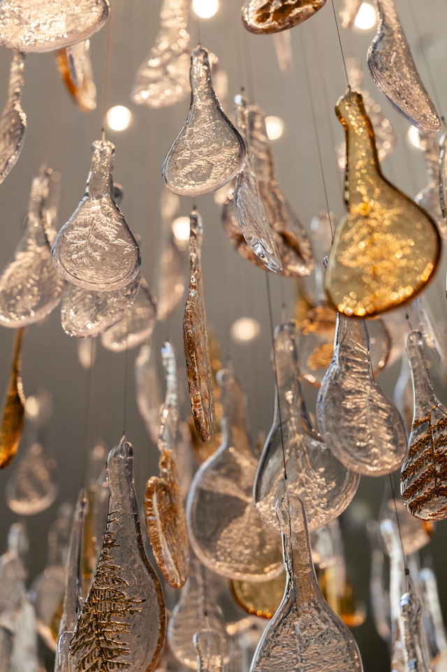 Adjustable steel cable lengths (2–5m) fit different ceiling heights, and 110–240V compatibility suits global installations. The combination of crystal glass and steel cables balances aesthetics and safety, while 25,000-hour LEDs reduce maintenance costs. More than a light source, it’s a natural art installation: the cluster of water drops conveys the lightness and agility of raindrops, while the crystal texture highlights luxury, realizing the integration of natural elements and high-end design.