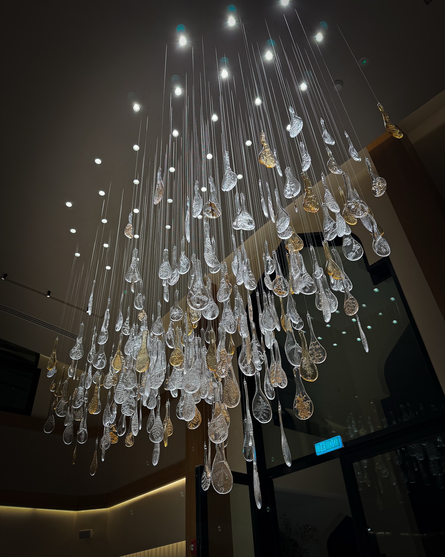 This water drop-shaped chandelier centers on hand-blown crystal glass water drops (high-transparency, scratch-resistant, strong light refraction), paired with a thin steel cable suspension system (invisible and stable) and built-in LED light sources (soft warm light). It mimics the natural form of raindrops falling, creating a dreamy and luxurious immersive ambiance.
