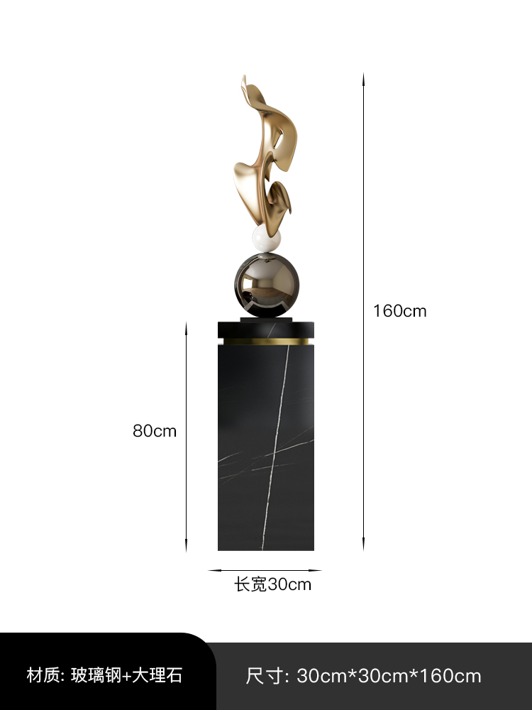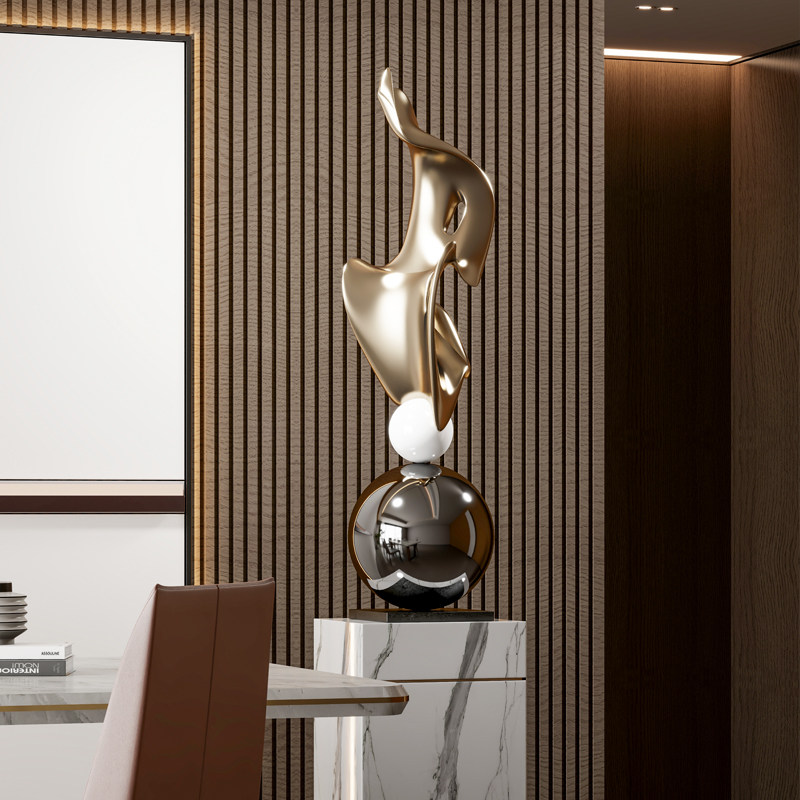 When flowing "metal ribbons" meet geometric spheres, the rhythm of minimalism and dynamism ripples through the space. This electroplated art sculpture uses mirror stainless steel to shape smooth curves, like frozen light and shadow stretching in the space; the collision between the middle white porcelain ball and the shiny black metal ball enhances the material contrast, and with the marble base, it naturally exudes light luxury texture.