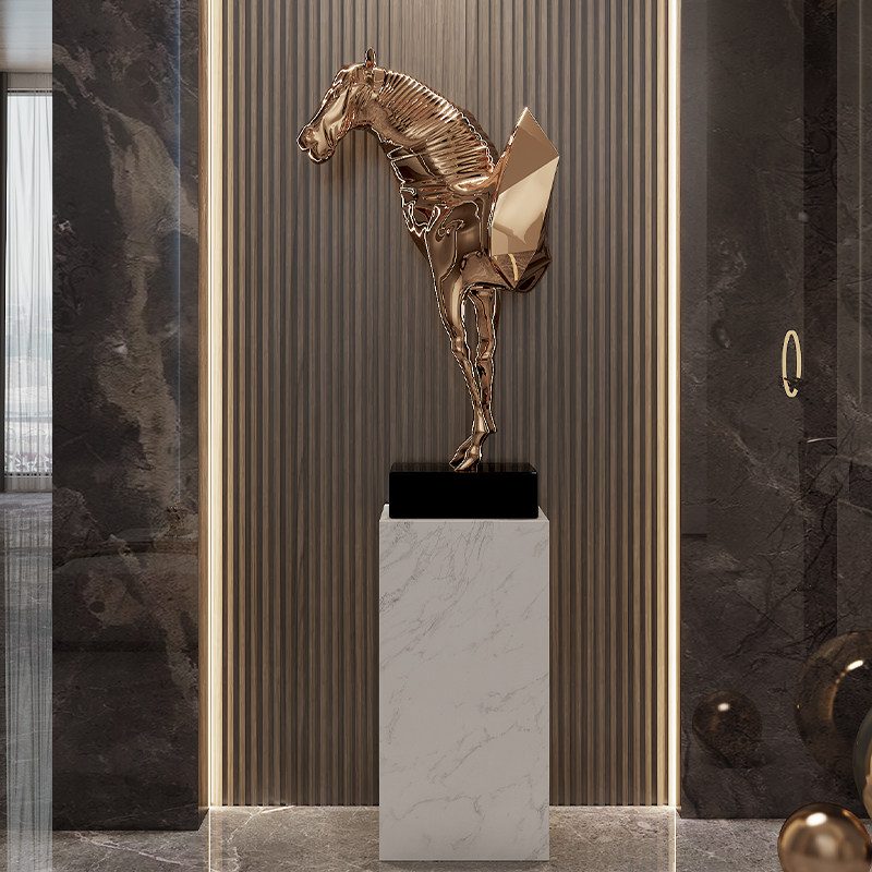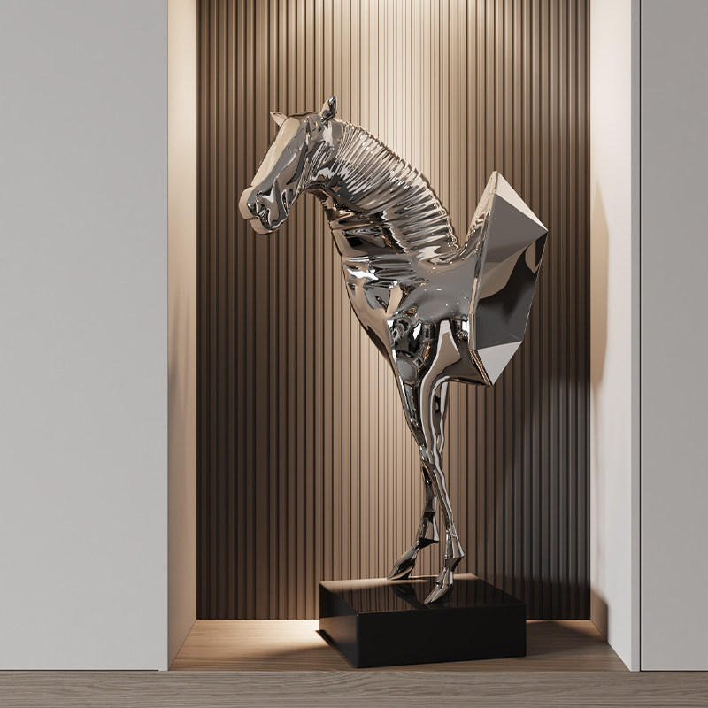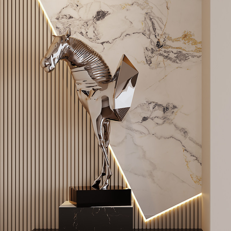 - Style: Futuristic minimalism + industrial deconstruction style, reshaping the traditional horse head shape with geometric cuts, combining "sense of technology" and "artistic tension", conforming to the avant-garde decoration trend of high-end spaces